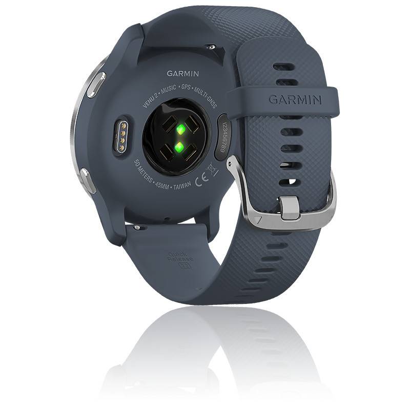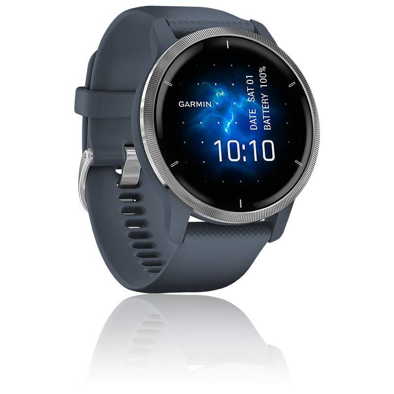 Garmin est connue pour ses montres GPS aux nombreuses fonctions, utiles et indispensables ! Créée en 1989, cette marque n'a cessé de se développer et fait aujourd'hui partie des références en terme de montres intelligentes et tactiles. La marque américaine vous dévoile sa nouvelle montre, la Venu 2 Silver 010-02430-10. Celle-ci se pare d'un boîtier en polymère renforcé de fibres, avec cache arrière en polymère, mesurant 45 millimètres de diamètre, surplombé par une lunette ciselée en acier inoxydable qui abrite son écran tactile haute-résolution AMOLED. Celui-ci est recouvert d'un ultra-résistant Gorilla® Glass qui viendra le protéger tout au long de vos aventures et qui évitera ainsi que l'écran soit rayé ou abîmé. Celui-ci vous permettra d'avoir accès à un bon nombre de fonctionnalités que vous retrouverez dans la partie "Les Fonctionnalités". Pour finir, la Venu 2 Silver 010-02430-10 se dote d'une étanchéité de 5 ATM, ce qui équivaut à 50 mètres, ainsi que d'une autonomie exceptionnelle !
