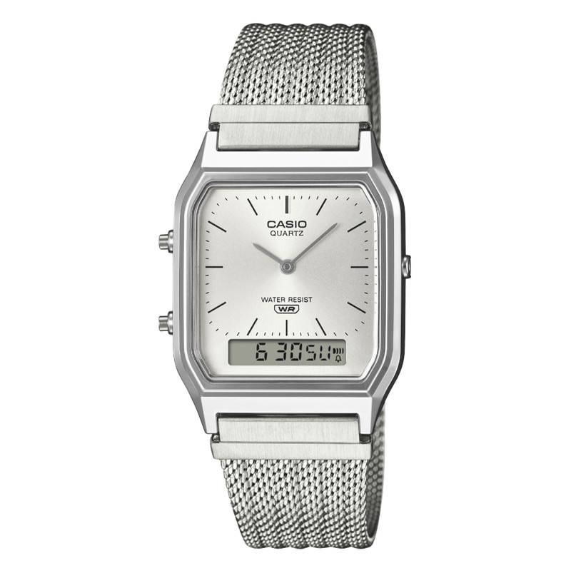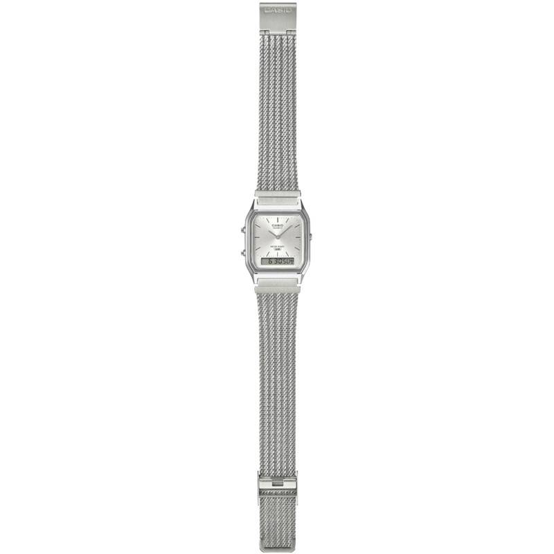 Le bracelet de cette montre Casio Vintage est en acier inoxydable, conçu dans une luxueuse finition maille milanaise grise qui assure durabilité et confort. La maille milanaise est non seulement esthétiquement plaisante, mais elle assure également une respirabilité et un ajustement optimal, même lors de journées chaudes. Le fermoir à coulisse apporte une adaptabilité et une sûreté additionnelles, permettant de mettre et retirer la montre facilement tout en assurant un port sécurisé.