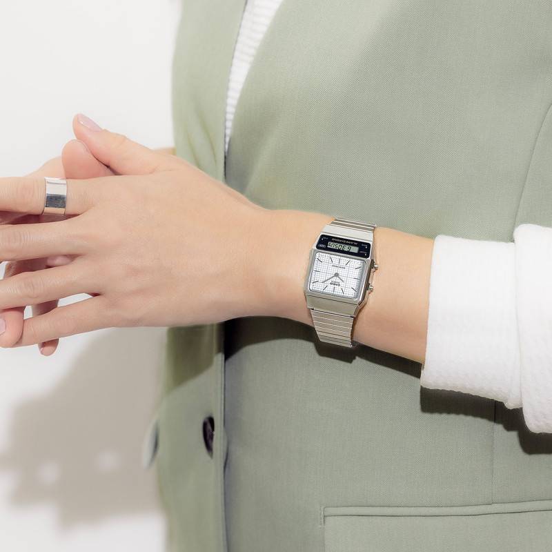 Venue tout droit du Japon, la marque emblématique Casio est devenue aujourd'hui une des figures incontournables et populaires sur le marché de l'horlogerie grâce à ses créations originales et tendances conçues pour permettre aux hommes comme aux femmes d'affirmer leur style et de s'exprimer plus librement. Issue de la collection Vintage Edgy, ce garde-temps AQ-800E-7AEF réinterprète le modèle de la Casio AQ-450 des années 1980 avec un design moderne, élégant et classe. Son boîtier rectangulaire fait 40,7 mm de longueur et 32 mm de largeur pour 8,7 mm d'épaisseur, parfait pour être porté aussi bien par les hommes que par les femmes. Il est conçu en résine plaquée chrome et il pèse 52 gr. Le bouton-poussoir placé à sa droite vous permettra de régler l'heure analogique. Tandis que deux boutons-poussoir supplémentaires trouveront leur place sur le côté gauche pour vous servir à manipuler l'écran digital. Un verre acrylique surplombe le cadran et viendra le protégera contre les chocs de l'usage de tous les jours. Pour finir, le fond emboîté de cette montre assure une étanchéité de 3 ATM.