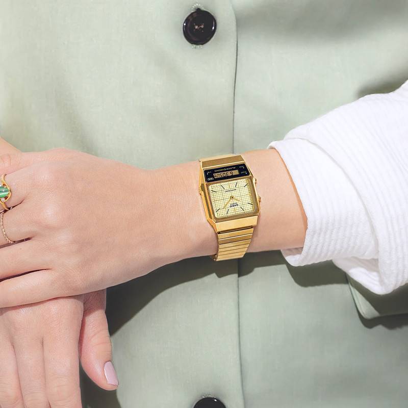 Une des marques chef de file de l'horlogerie, Casio nous séduit de jour en jour par ses créations numériques. Auparavant futuristes, les montres Casio sont devenues aujourd'hui des accessoires incontournables et indispensables pour tous les amateurs de mode. Inspirée du modèle concept AQ-450 des années 1980, découvrez cette montre AQ-800EG-9AEF issue de la collection Vintage Edgy. Elle conjugue le style rétro et le design élégant pour embellir aussi bien les poignets féminins que masculins, en jour comme en nuit. Son boîtier rectangulaire, conçu en résine PVD doré, mesure 40,60 mm de longueur et 32 mm de largeur avec une épaisseur de 8,70 mm et un poids de 52 gr. Le bouton poussoir logé à sa droite vous aidera à régler l'heure analogique tandis que les deux bouton-poussoirs présents sur le côté gauche vous serviront à régler l'heure numérique et à manipuler les différentes fonctions mises à votre disposition. Son cadran est surplombé d'un verre acrylique qui le protégera des éraflures et chocs du quotidien. Enfin, cette montre est étanche jusqu'à 30 mètres grâce à son fond de boîte emboîté.