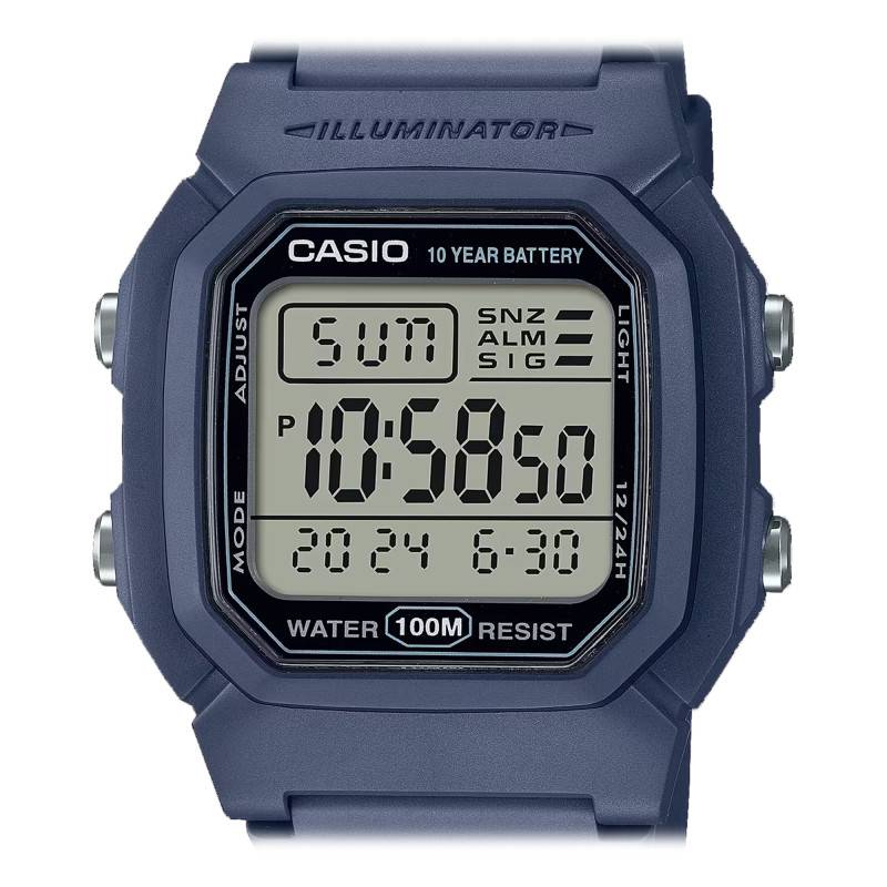 D'origine japonaise, la marque Casio Vintage s'élargit dans le domaine horloger en proposant des montres performantes. Elle élabore des garde-temps alliant résistance et technicité, faisant d'eux des indispensables au quotidien. Ces modèles sont réalisés à partir de matériaux solides et sont munis de mécanismes précis pour plus de précision. Découvrez la montre W-800H-2AVES qui vous accompagnera dans vos plus grandes aventures. Habillée d'un ton bleu, elle se pare d'un boîtier de 37 gr qui est entièrement fabriqué en résine. De forme octogonale, celui-ci affiche 44,20 mm de longueur et 36,80 mm de largeur avec une épaisseur de 13,40 mm. Il est surmonté par un verre acrylique qui protège son cadran des chocs et se trouve muni de part et d'autres de sa carrure de 4 boutons-poussoir qui vous permettront d'actionner les différentes fonctions. Signée “Illuminator” sur le haut, cette montre dispose d'une étanchéité de 10 ATM qui est assurée par son fond de boîte.