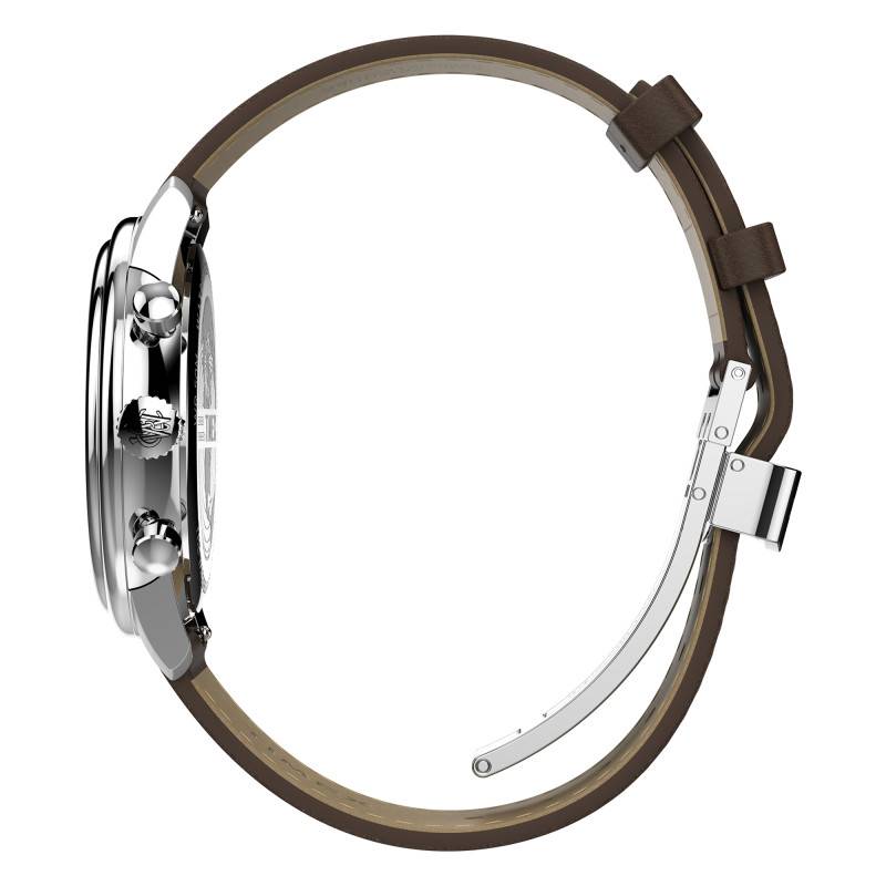 Le cadran de cette montre est une merveille de simplicité et de fonctionnalité. D'une subtile couleur beige, il attire le regard par sa finition mat élégante, évitant les reflets indésirables, et garantissant ainsi une lisibilité parfaite. Les aiguilles, ainsi que les chiffres arabes et les index, sont luminescents, vous assurant un affichage clair même dans des conditions de faible luminosité. Sur le cadran, un chemin de fer encercle les chiffres, ajoutant une note rétro sophistiquée à l'ensemble. Deux sous-cadrans, dédiés au chronographe, prennent place harmonieusement, l'un affichant les 24 heures et l'autre les 60 minutes.