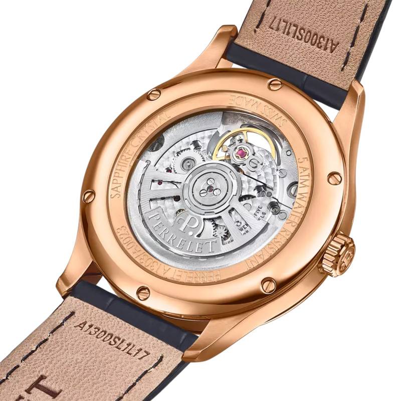 Fidèle à ses principes, toutes les montres de la marque horlogère suisse Perrelet sont équipées de mouvements à remontage automatique issu de leur manufacture ! Celui de la montre Weekend A1303/3 est un calibre automatique suisse de type P-391 qui assure une réserve de marche de 42 heures. Il oscille à 28,800 alternances par heure et renforme 25 rubis.