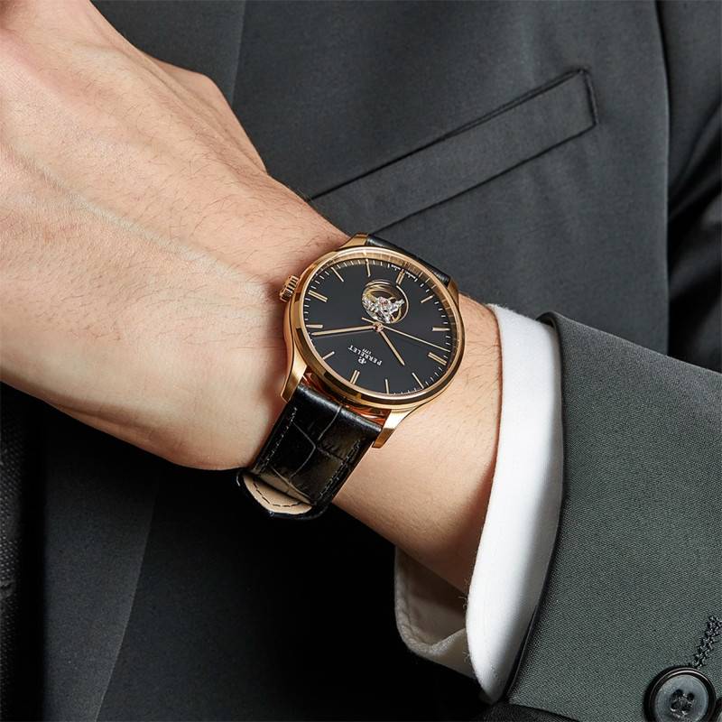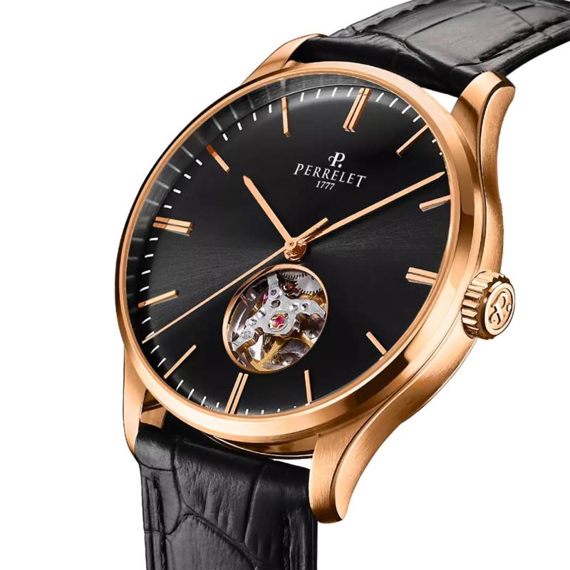 Le minimalisme citadin et contemporain de ce cadran rencontre avec élégance l'authenticité de l'univers rétro ! La marque Perrelet nous présente un magnifique cadran soleillé d'un noir intense, parsemé d'indices or rose. Un cœur ouvert placé vers 6h dévoile agréablement les battements du mécanisme automatique. Le chemin de fer des minutes est parcouru avec précision par une très longue trotteuse fil or rose qui semblerait presque effleurer le pourtour du cadran ! Elle indique le temps aux côtés des aiguilles or rose et lisses des heures et des minutes qui, quant à elles, ont une forme bâton qui se finie par une légère pointe. Leur esthétique se marie à merveille avec les fins et longs index bâton des heures, également de couleur or rose, qui sont doubles à 3h, 6h, 9h et 12h. Enfin, une fine signature de la marque est indiquée en blanc vers 12h et la fabrication suisse du modèle est précisée à 6h.