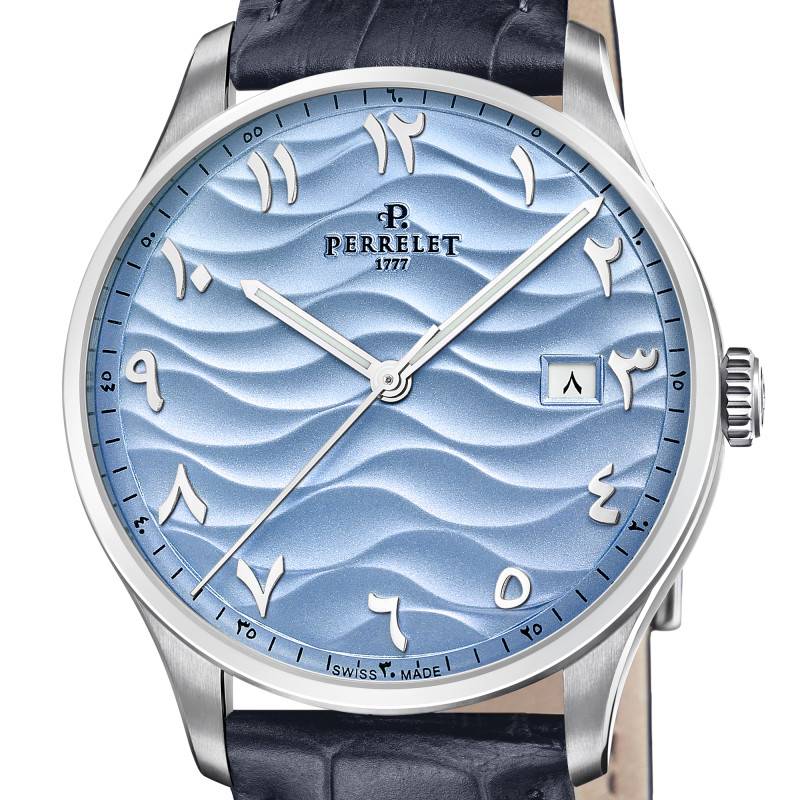 Le cadran de la montre Weekend Arctic Dunes est en lui-même une ode au savoir-faire horloger. Sa teinte bleue est mise en valeur par un motif gravé représentant des dunes de neige ondulée, inspirées par les formes élégantes et fluides des congères sculptées par le vent. Cette surface créative multiplie les effets de lumière, rendant chaque regard porté sur le cadran aussi enchanteur qu'un paysage montagnard lumineux. Les chiffres en arabes affichés apportent une touche d'authenticité et une élégance rare, parfaitement en accord avec l'esprit de cette édition limitée, produite à seulement 99 exemplaires. Un guichet date discret a été intégré pour optimiser la fonctionnalité, flanqué d'aiguilles luminescentes qui garantissent une lisibilité parfaite même dans l'obscurité.