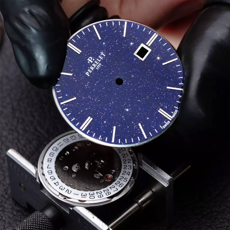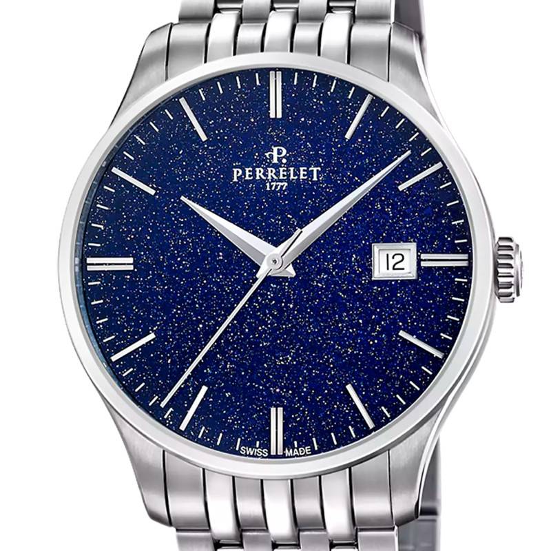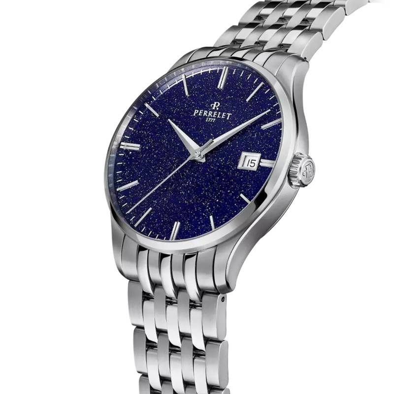 Le cadran de cette montre est une véritable œuvre d'art avec sa magnifique finition aventurine qui lui confère des nuances bleues profondes et une texture unique. Les index, assortis d'un chemin de fer des minutes, facilitent la lecture de l'heure en apportant une clarté et une précision remarquables. Une ouverture pour le guichet date, parfaitement intégrée, se situe sur le côté donnant ainsi un équilibre visuel harmonieux. La nomination de la marque Perrelet est élégamment placée, consolidant l'identité prestigieuse de ce garde-temps.