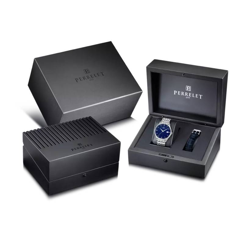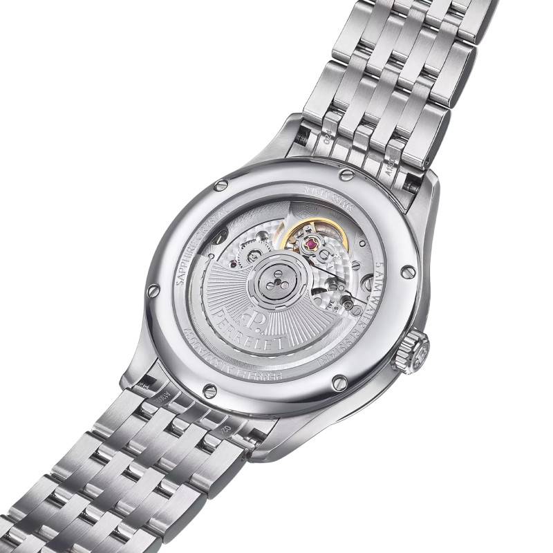 Cette montre, véritable icône de l'élégance masculine, porte fièrement les valeurs de la tradition horlogère suisse. Conçu par Perrelet, le boîtier en acier inoxydable se distingue par sa forme ronde intemporelle et ses dimensions équilibrées avec un diamètre de 39,00 mm et une épaisseur de 9,50 mm, procurant un confort optimal au poignet. La finition du verre saphir bombé renforce la durabilité tout en offrant une visibilité exceptionnelle. Le fond de boîte, à la fois maintenu par des vis et transparent, révèle une partie du mécanisme, témoignage de la qualité et du souci du détail propre à la maison suisse.