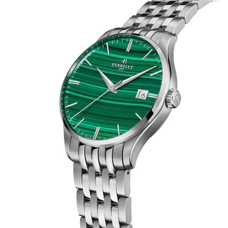 Le cadran de cette montre est véritablement saisissant grâce à sa finition en malachite, qui lui confère un charme naturel et distinctif. Parsemé d'index argentés et de chemin de fer, le cadran propose une lisibilité parfaite tout en conservant son allure sophistiquée. Les aiguilles des heures, des minutes et des secondes glissent harmonieusement sur ce fond vert captivant, animé par un élégant guichet date à 3 heures. C'est une œuvre d'art visuelle qui reflète la maîtrise et l'attention au détail des horlogers suisses.