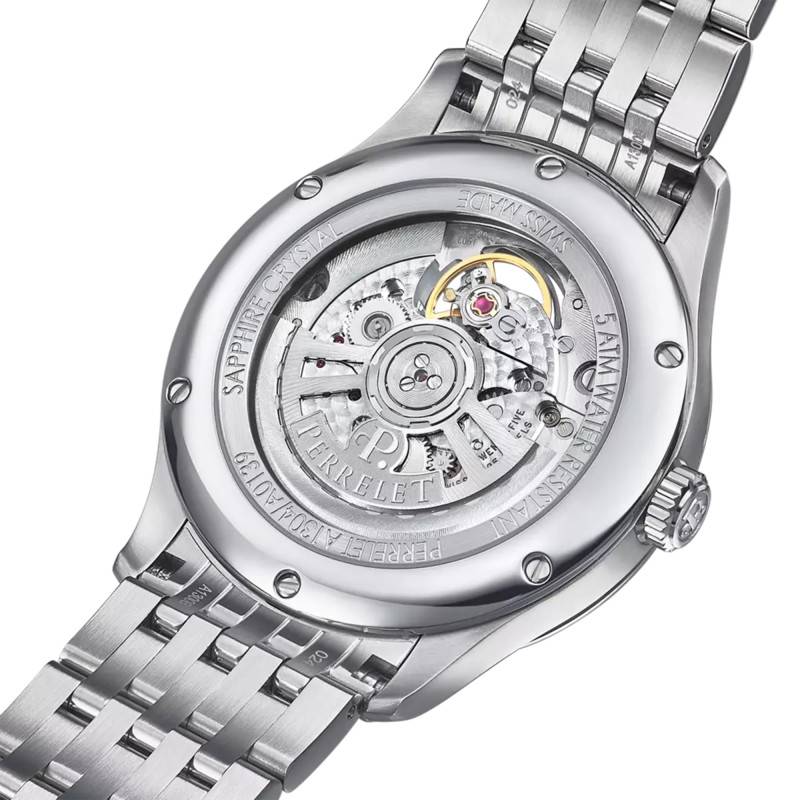 La maison horlogère suisse Perrelet, adepte de l'excellence dans la fabrication de ses modèles, équipe ses montres de mécanismes à remontage automatique tous issus de sa manufacture ! La montre A1302/6 ci-contre possède le calibre P-391, qui affiche les heures, les minutes et les secondes. Elle conserve sa bonne précision durant une réserve de marche de 42 heures. Ses 25 rubis apportent une belle fluidité au mécanisme qui oscille à 28,800 alternances par heure.