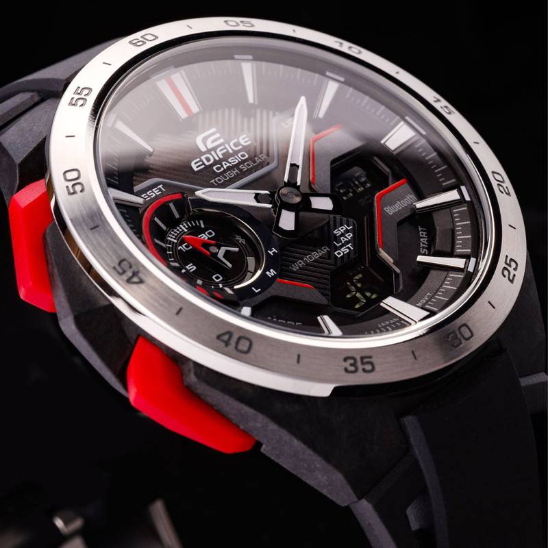 Depuis son lancement dans l'univers de l'horlogerie, Casio met l'accent sur la qualité supérieure, le design et les fonctions. La collection Edifice comprend des modèles qui montrent leur engagement à s'imprégner des nouvelles technologies. La montre Windflow ECB-2200P-1AEF de cette gamme est conçue pour plaire aux adeptes de modèles performants et pratiques au quotidien. Elle est dotée d'un boîtier rond de 48,20 mm de diamètre et de 11,90 mm d'épaisseur pour une longueur corne à corne de 47,60 mm et un poids de 126 grammes. Celui-ci est conçu en fibre de carbone et comporte une lunette de couleur argentée marquée par une graduation des minutes. Le tout est couronné par un verre minéral plat qui offre une vue claire sur le cadran. Sur les côtés de la carrure se place un bouton-remontoir ainsi que trois boutons poussoirs. Enfin, le fond de boîte assure une étanchéité de 10 ATM.