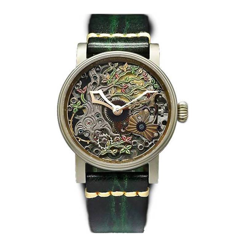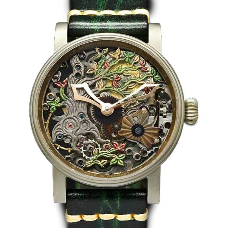 En Allemagne, les artisans de l'atelier Schaumburg Watches s'efforcent de donner le meilleur d'eux-mêmes afin de respecter qualité, précision et esthétisme. Pour réussir la combinaison de ces éléments, la maison fabrique à la main ses bracelets de cuir et ses mouvements mécaniques. Ainsi, tout le processus de fabrication est maîtrisé et vous assure une véritable fiabilité. Le garde-temps "Wonderland" ou "Pays des Merveilles" est une montre singulière grâce à son design extrêmement bien pensé. La qualité des matériaux est également au rendez-vous. Cette montre est équipée d'un boîtier de 42mm de diamètre en acier brossé et poli. Le cadran est bien protégé grâce à un verre saphir inrayable. Une jolie couronne ronde taillée orne la droite du boîtier. A l'arrière, le fond est vissé et transparent, décoré de bijoux, de rouages verts et d'ornements couleur argent et or. Cette précieuse montre vous propose une étanchéité de 5 bar.