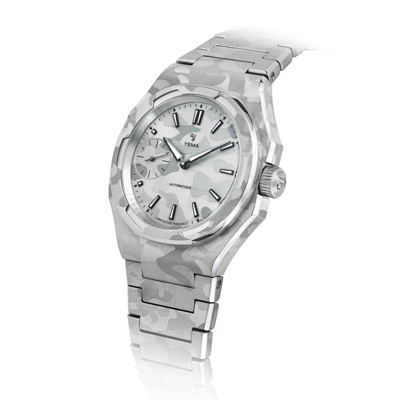 Le cadran de la Yema Wristmaster Slim CMM.29, avec son motif camouflage en blanc et gris, est une pièce maîtresse mêlant originalité et fonctionnalité. Conçu pour offrir une lisibilité optimale, il affiche les heures, minutes et secondes grâce à des aiguilles raffinées et des index, tous deux luminescents pour être visibles même dans les conditions de faible luminosité. Ce cadran à affichage analogique est protégé par un verre saphir plat, reconnu pour sa résistance inégalée aux rayures et aux chocs. La présence d'un compteur dédié à la petite seconde ajoute une touche d'élégance classique à l'ensemble, tout en augmentant la précision de la lecture du temps.