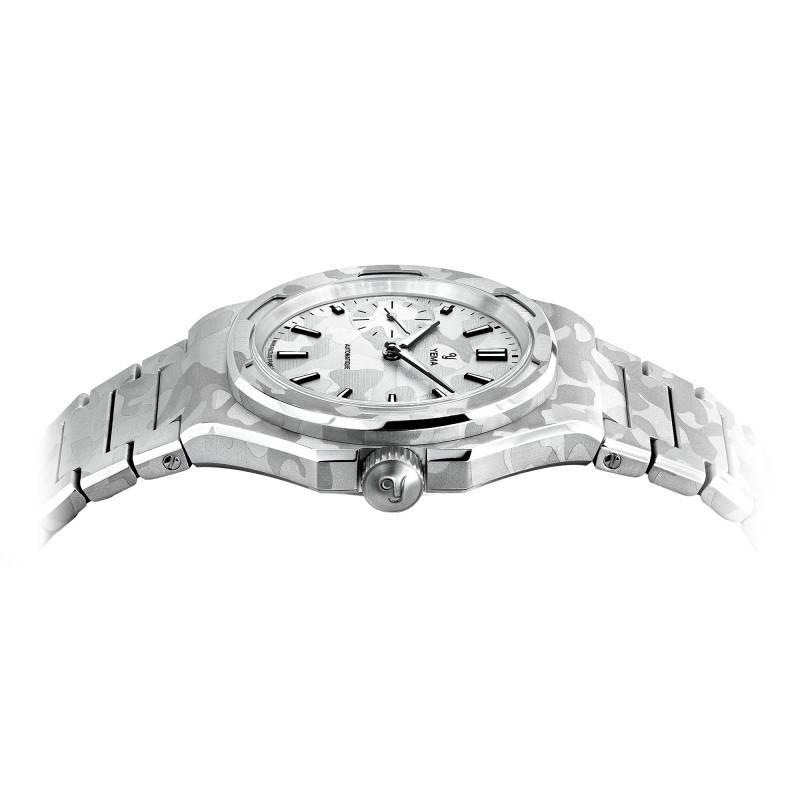 Le bracelet de cette montre est un ouvrage d'art réalisé en acier inoxydable 316L, décoré d'un motif camouflage en accord parfait avec le boîtier. Ce matériau n'est pas seulement apprécié pour sa robustesse, mais également pour son élégance intemporelle. Le système de boucle déployante contribue non seulement à son allure élégante, mais offre également un confort et une sécurité supplémentaires, permettant un ajustement précis au poignet.