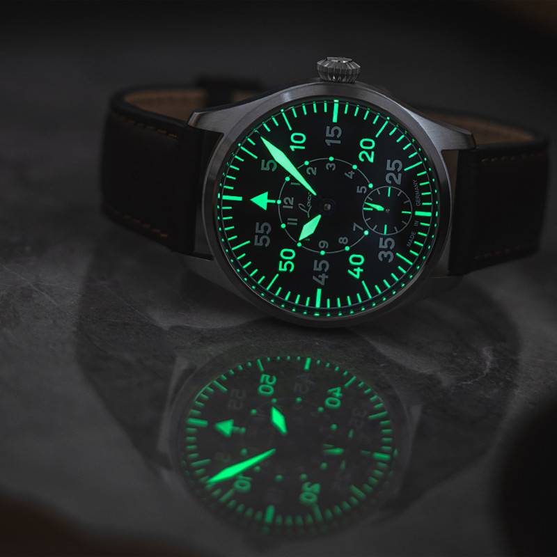 Ce magnifique cadran est doté d'un fond noir mis en avant par une finition mate pour plus d'élégance. Son pourtour affiche un chemin de fer des minutes qui facilite la lecture horaire. Il est suivi de chiffres arabes blancs allant de 5 à 55 qui vous apporteront plus de précision sur les minutes et les secondes. Quant aux heures, elles vous seront communiquées par des chiffres arabes centraux allant de 1 à 12 pour plus de précision sur le temps. Au centre du cadran, se trouvent deux aiguilles qui oscillent afin de vous communiquer les heures et les minutes. Celles-ci, ainsi que les index qu'elles survolent, sont bleuies thermiquement et remplies d'un traitement SuperLuminova C3 qui vous assurera une bonne lisibilité dans le noir. Pour plus de précision sur le temps, un compteur prend place à 6 heures dans le but d'afficher les petites secondes. Pour finir, le nom de la marque est apposé vers midi.