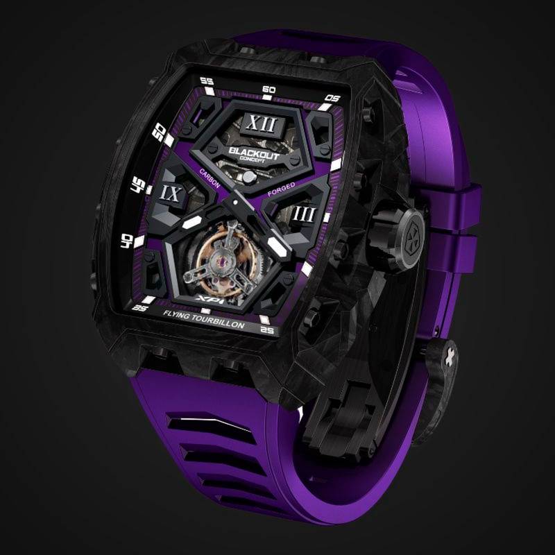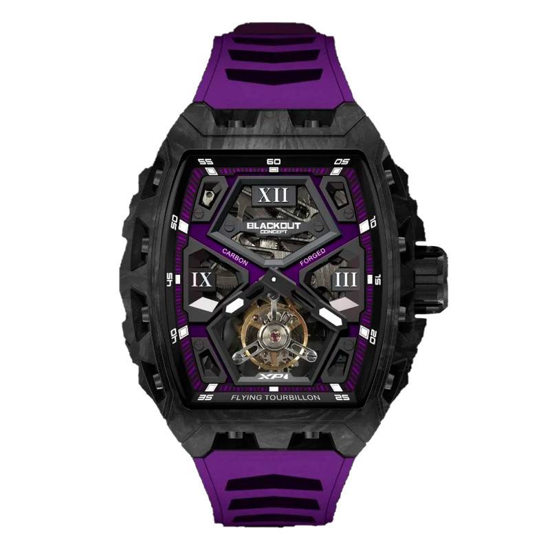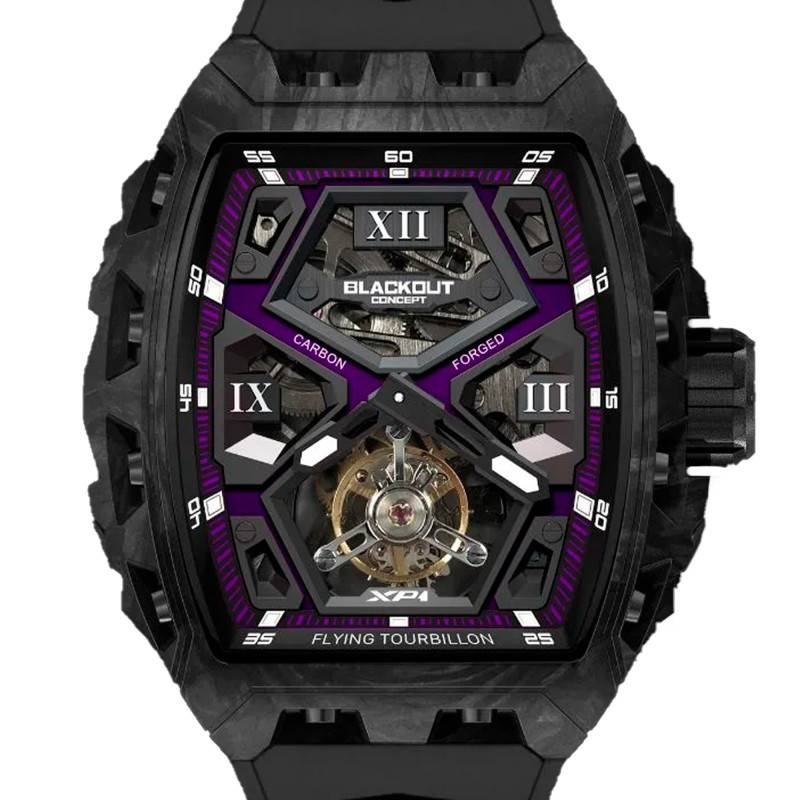 Blackout Watches se distingue dans le monde horloger par son approche innovante et son design résolument moderne. La marque est reconnue pour ses montres au style épuré qui reflètent un esthétisme sophistiqué et minimaliste. Elle se consacre à l'innovation technique et à la précision en intégrant à ses créations des mouvements de haute qualité, souvent issus de manufactures réputées, garantissant ainsi une performance fiable et une mesure du temps précise. En mettant l'accent sur une esthétique sombre et élégante, Blackout Watches utilise des matériaux de haute qualité pour fournir des pièces non seulement visuellement impressionnantes mais aussi robustes et durables. Cette approche unique permet à l'entreprise de se démarquer avec des créations qui allient parfaitement la fonctionnalité et le design avant-gardiste. Ce modèle XP1 Tourbillon LT Ultraviolet dispose d'un boîtier de forme tonneau fabriqué en carbone forgé UAC qui s'illumine dans le noir grâce à sa composition en luminova. Il se pare d'une couleur noire qui lui donne la possibilité de se marier avec plusieurs types de tenues. Il affiche une largeur de 44 mm, une longueur de 52 mm avec une épaisseur de 14,80 mm. Vous conviendrez que ses dimensions sont adaptées aux poignets de la gent masculine. Ce boîtier pèse 110 gr et il abrite un cadran qui est protégé par un verre saphir très résistant. Ce dernier assure une protection optimale contre les rayures et les chocs quotidiens auxquels il est souvent exposé. Par ailleurs, pour régler les aiguilles, vous pourrez utiliser le bouton remontoir qui prend place à 3 heures. Cette montre est munie d'un fond de boîte maintenu par des vis assurant une étanchéité de 10 ATM, soit 100 mètres de profondeur. Celui-ci est également transparent, offrant une vue d'ensemble sur le mécanisme en action.