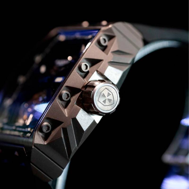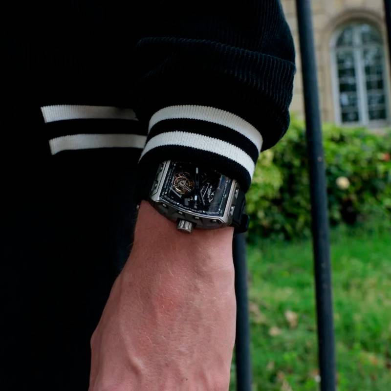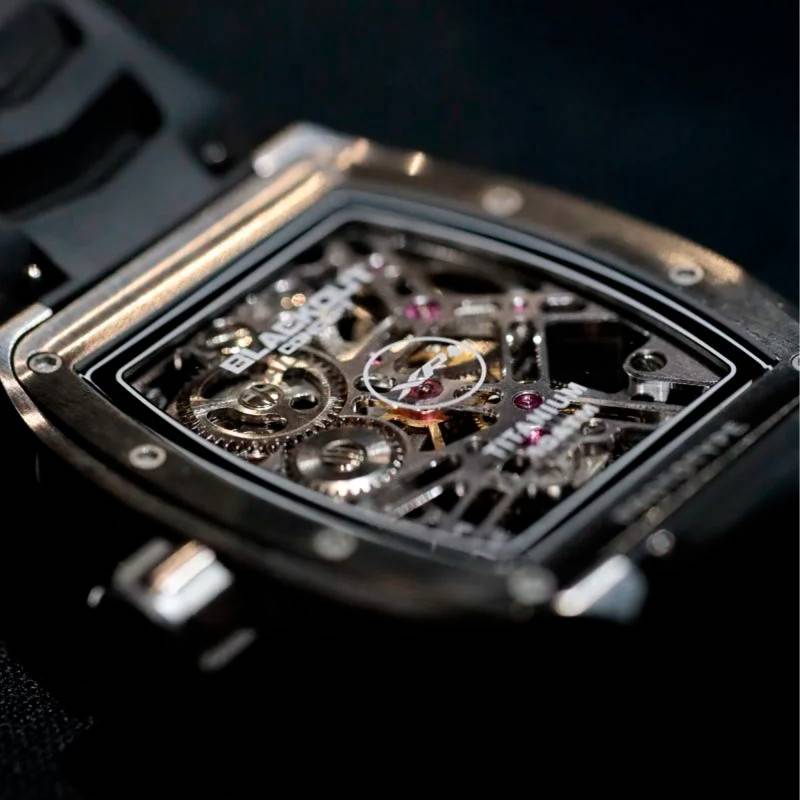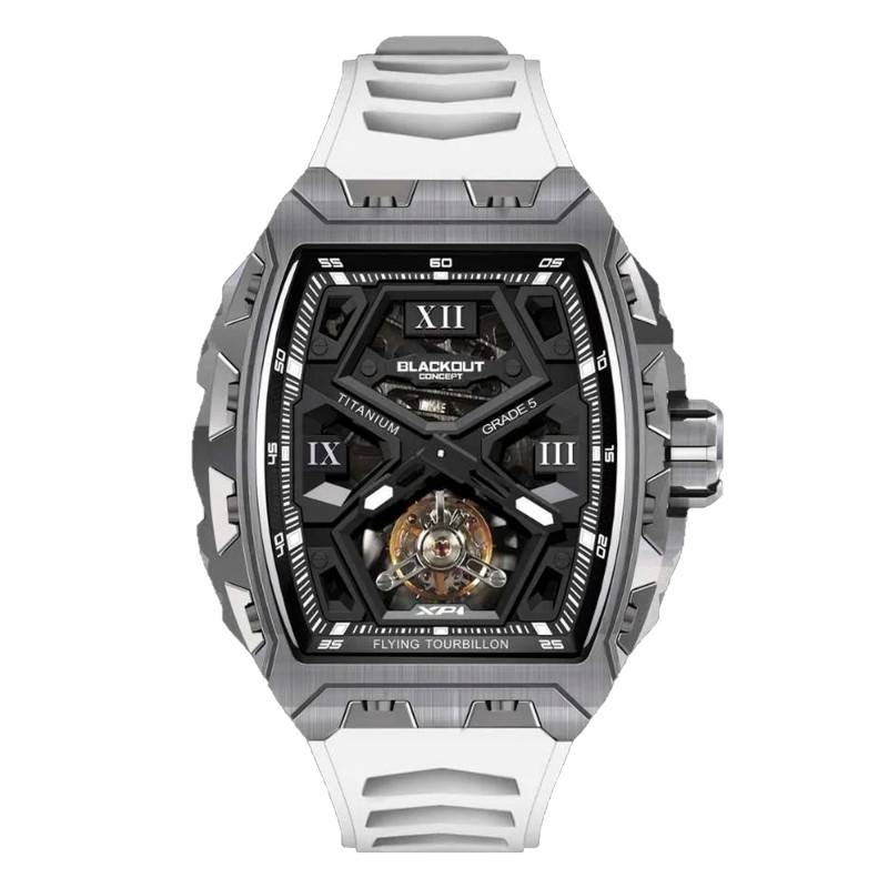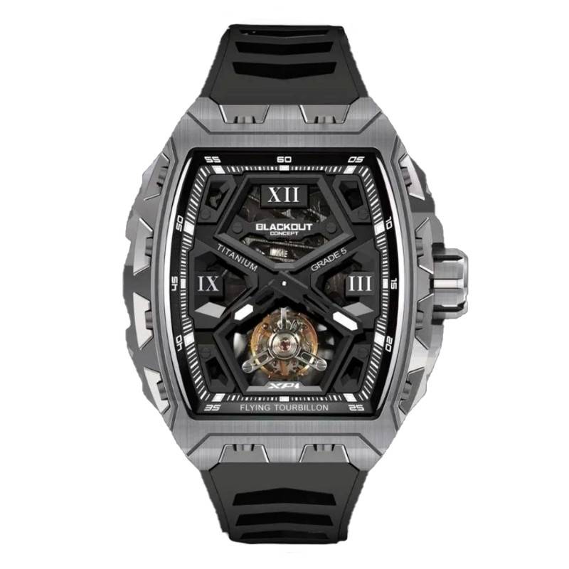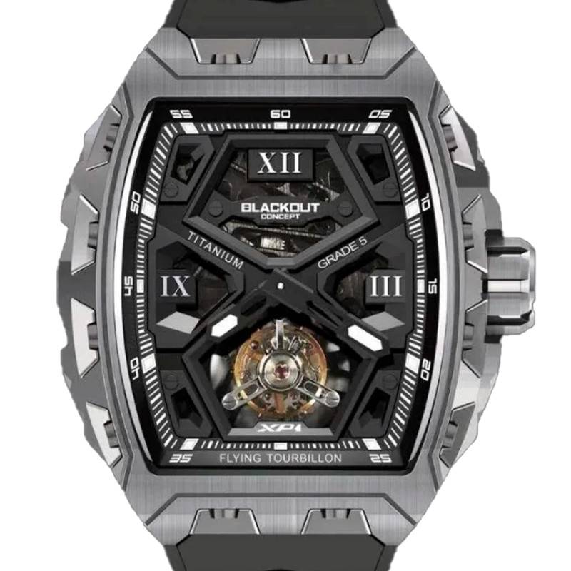 Blackout Watches est une marque de montres renommée pour son design audacieux et distinctif, caractérisé par une esthétique moderne. Spécialisée dans les créations horlogères au look racé et minimaliste, la marque utilise des matériaux de haute qualité pour garantir à la fois durabilité et confort. Avec une attention particulière aux détails et une passion pour l'innovation technique, Blackout Watches propose des modèles qui allient sophistication et performance, comblant de joie ceux qui cherchent à se démarquer. Dans la collection XP1, se trouve cette merveilleuse montre Tourbillon Ti. Il revêt une couleur gris foncé qui lui donne la possibilité de se marier avec un large choix de tenues. Ce dernier dévoile 44 mm de largeur, 52 mm de longueur, 14,80 mm d'épaisseur avec un poids de 113 gr. Vous conviendrez que ces dimensions siéront à merveille aux poignets de la gent masculine. Par ailleurs, ce boîtier est rehaussé d'un verre saphir résistant qui assure la protection optimale du cadran contre les rayures et les chocs extérieurs auxquels il est souvent exposé. Le réglage des heures et des minutes est possible grâce au bouton remontoir positionné à 3 heures. Par ailleurs, ce modèle dispose d'un fond de boîte maintenu par des vis qui procure une étanchéité de 10 ATM. Celui-ci est aussi transparent, accordant une vue d'ensemble sur le mécanisme en action.