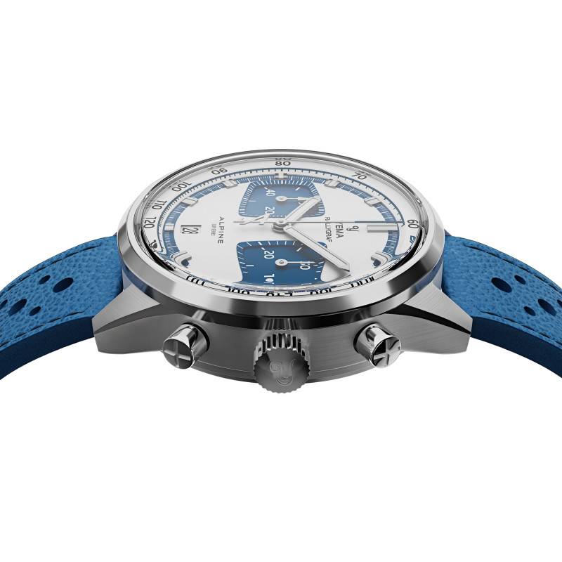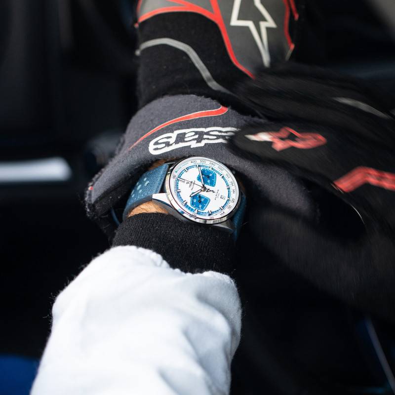 Le bracelet ajoute une touche finale d'élégance à cette montre avec son cuir de bovin bleu, travaillé en couture perforée. Sa texture en cuir grainé capture l'essence même du style classique des courses automobiles françaises. Avec une entrecorne de 20 mm, il offre un ajustement impeccable et confortable au poignet. La boucle ardillon garantit une fermeture sécurisée tout en ajoutant une note de sophistication discrète.