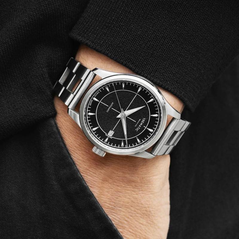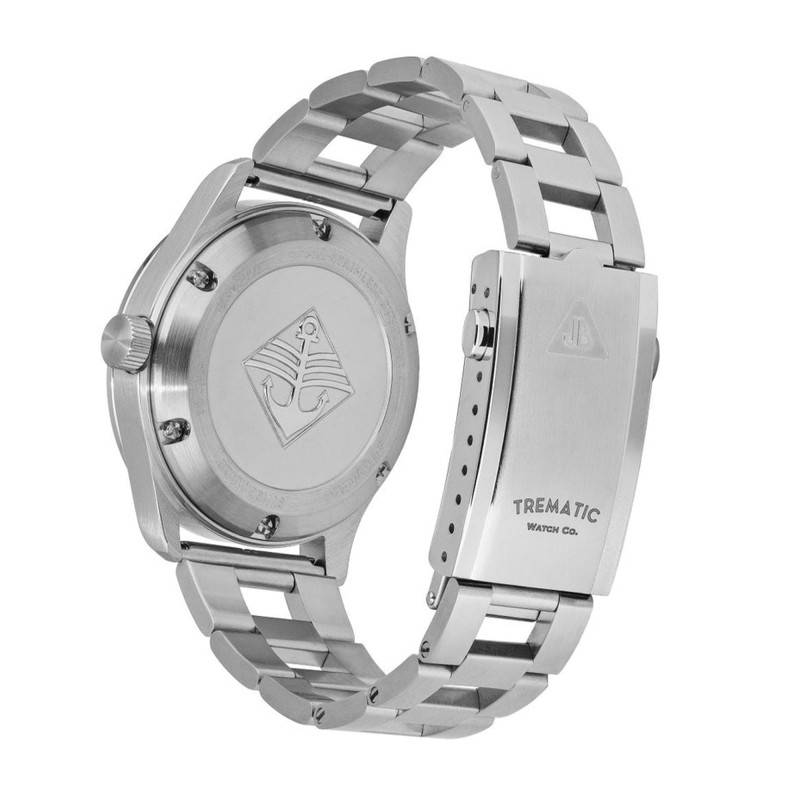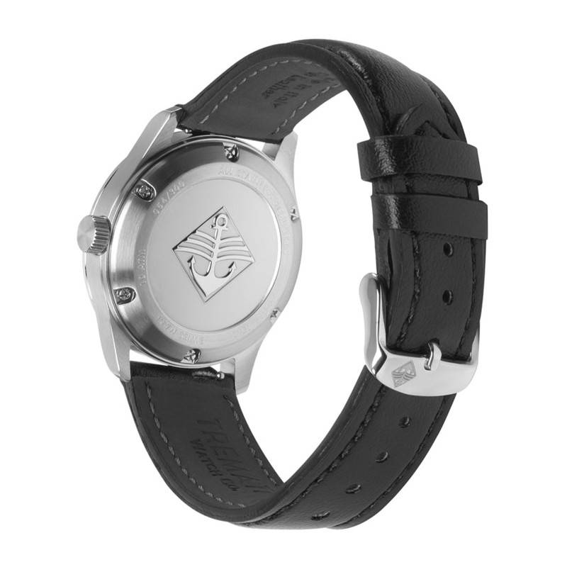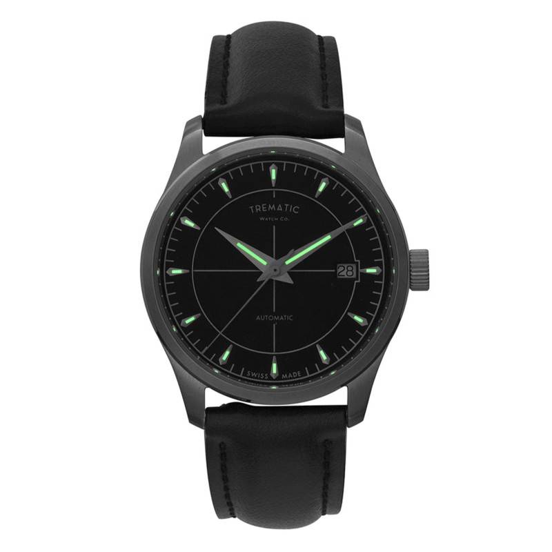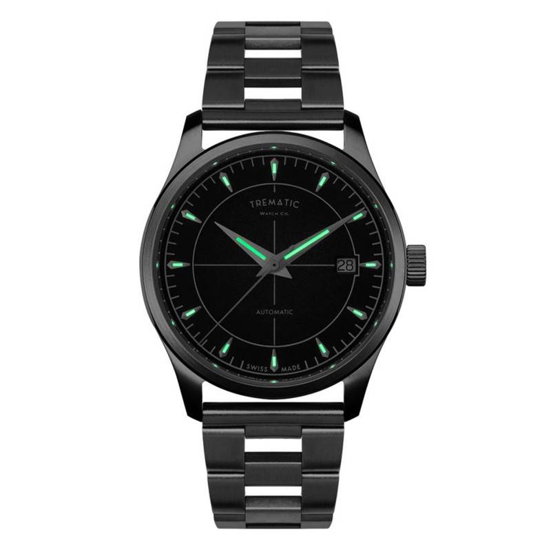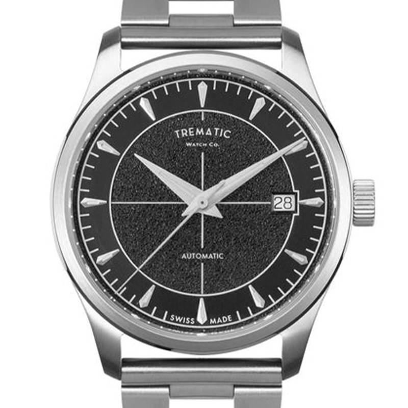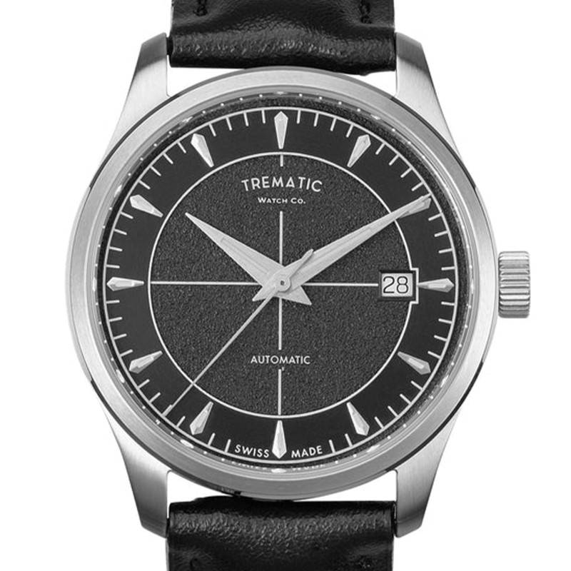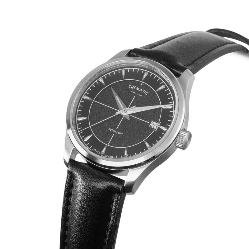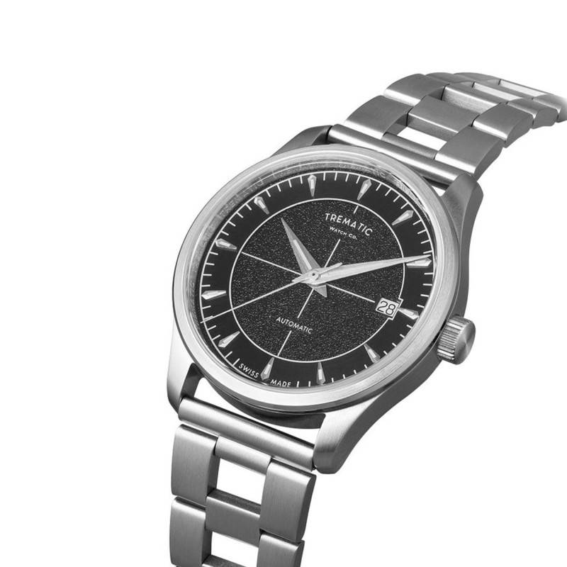 Le cadran de cette montre Trematic se distingue par sa finition double cercle et son aspect sablé qui ajoutent profondeur et texture à son design. Sa couleur noire offre un contraste chic, faisant ressortir les index luminescents, facilitant ainsi la lecture dans toutes les conditions d’éclairage. Un chemin de fer intègre harmonieusement les minutes autour du cadran, permettant une lecture précise de l’heure. Les aiguilles, également luminescentes, de style sobre, complètent cet ensemble harmonieux en glissant élégamment au-dessus du guichet date positionné à 3 heures.