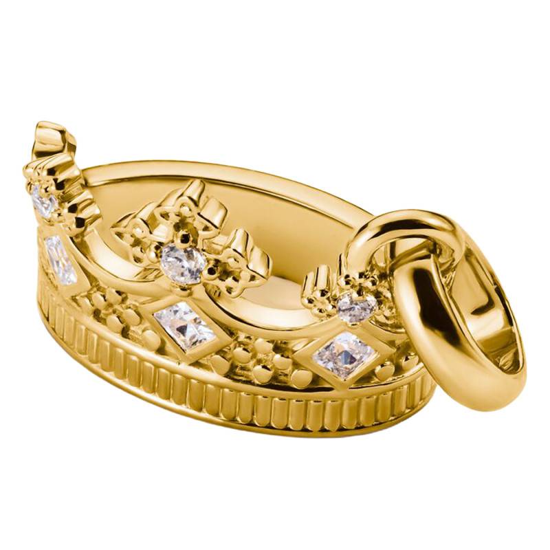 Ce somptueux Pendentif Charm Couronne est une ode à la majesté royale, finement ciselé dans de l'argent massif 925/1000, sublimé par un plaquage or 750/1000 (18K). Sa teinte dorée envoûtante, associée à la délicatesse des pierres en oxyde de zirconium blanches, confère à ce bijou une allure impériale et resplendissante. Avec une finition mate subtile, chaque détail de cette couronne miniature capte la lumière avec grâce. Sa largeur de 13 mm et sa hauteur de 19,50 mm apportent une dimension parfaite au charme authentique de ce pendentif. Le soin apporté à son design se manifeste à travers un serti massé et à grains, soulignant l'éclat des pierres précieuses.