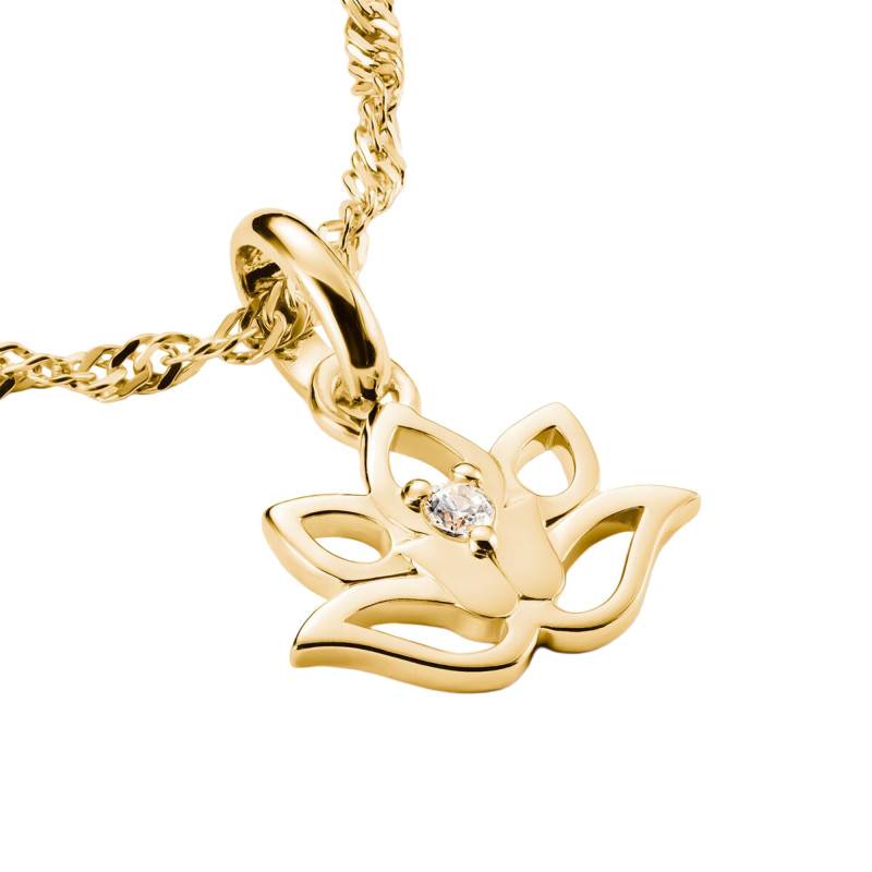 Découvrez le Pendentif Charm Fleur de Lotus en Argent 925 Recyclé Plaqué Or 750. Ce bijou délicat, au finition mate, évoque la pureté et l'équilibre. Confectionné en argent massif 925/1000 et sublimé par un plaquage en or 750/1000 (18K), il arbore un oxyde de zirconium d'un blanc immaculé, serti avec soin. Ses dimensions gracieuses, avec une largeur de 13,50 mm et une hauteur de 17 mm, s'harmonisent parfaitement avec sa légèreté de 0,90 g.