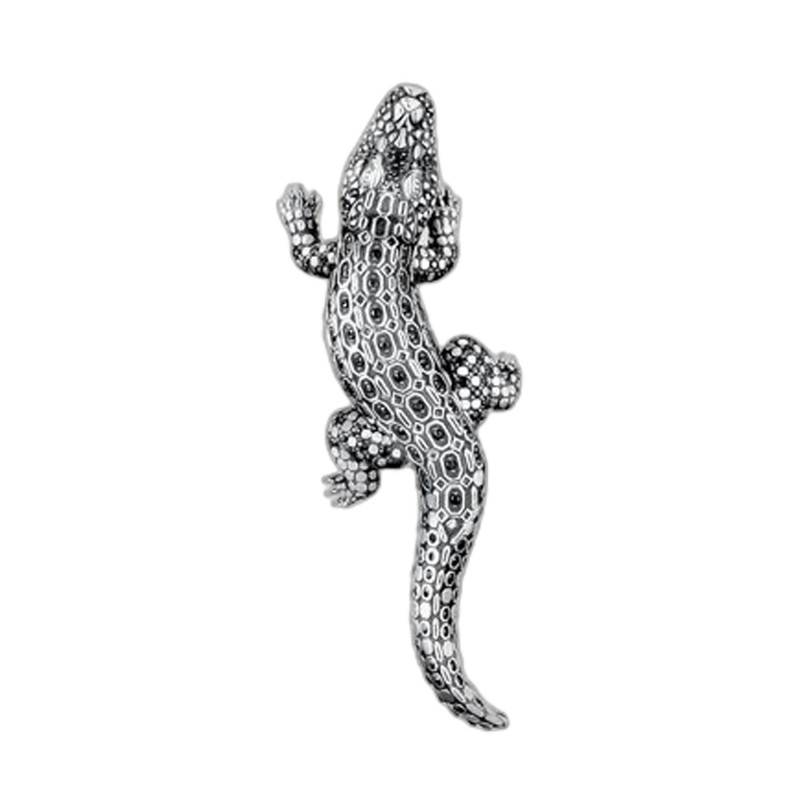 Évoquant la puissance de la nature, ce Pendentif Crocodile en Argent 925 Recyclé Noirci est une véritable création. Les pierres noires et vertes, subtilement serties à la manière d'un serri massé, confèrent une profondeur mystique à ce bijou. La largeur de 20 mm et la hauteur de 57 mm enchantent par leur présence discrète mais indéniable, tandis que la finition mate dégage une aura de luxe brut, réservée aux connaisseurs avertis.