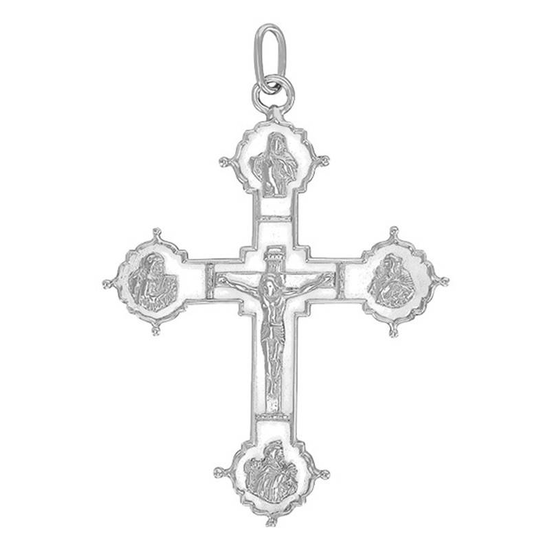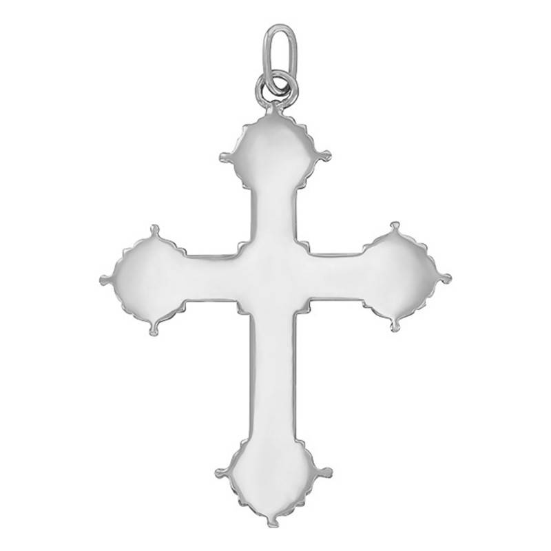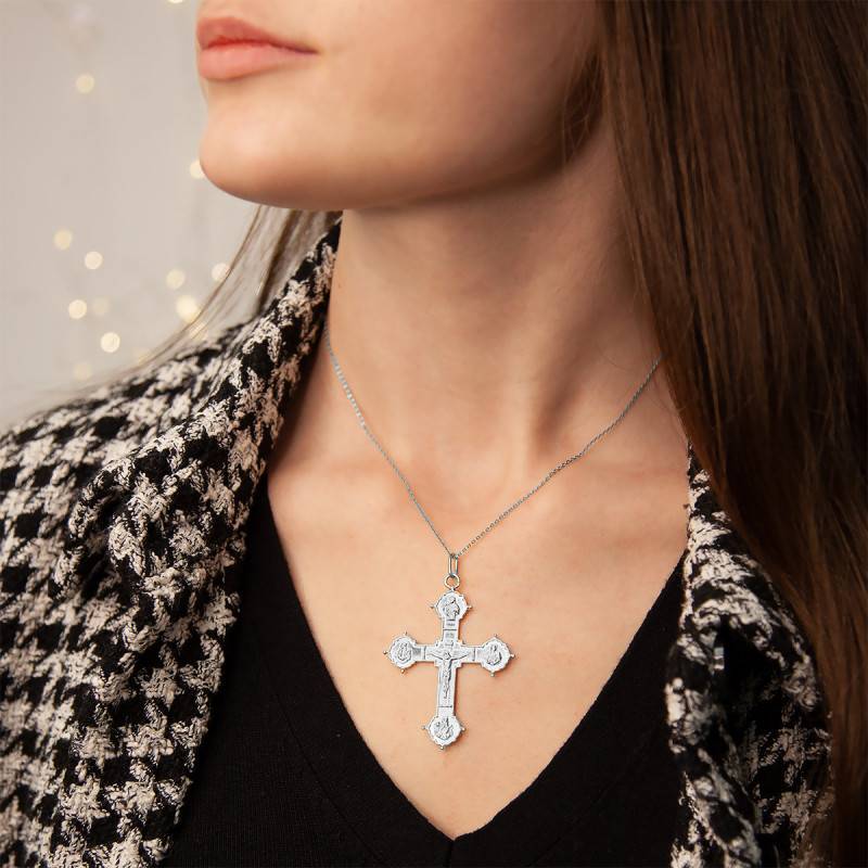 Découvrez cette magnifique croix arlésienne entièrement faite en or blanc 375/1000 (9K) ou 750/1000 (18K). A la fois classique et originale, elle se compose de 4 saints à chaque extrémité de la croix ainsi que d'un christ crucifié en son centre. Le pendentif possède une longueur de 54 mm, une largeur de 42 mm et une épaisseur de 1.6 mm. Relativement grand, il s'imposera à votre cou pour un look tendance. La bélière qui l'accompagne mesure 8.5 mm de longueur pour une largeur de 5.75 mm permettant de passer tous types de chaines. Enfin, le poids d'or moyen pour ce bijou est de 5.55 grammes pour l'or 375/1000 (9K) et de 7.60 grammes pour l'or 750/1000 (18K).