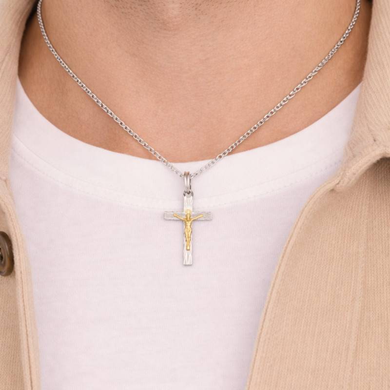 Découvrez le charme spirituel du Pendentif Crucifix Strié en Argent 925 Bicolore. Conçu avec soin, ce bijou habille le cou d'une lueur céleste, mêlant la sobriété de l'Argent massif 925/1000 à l'éclat doré du Plaqué Or (3 microns). Sa surface striée et ciselée reflète les lumières dans une danse divine de reflets argentés et dorés. En équilibre parfait entre tradition et modernité, ce pendentif de 21 mm de largeur et 37 mm de hauteur, d'un poids délicat de 1,20 g, invite à une spiritualité raffinée. Un gage de qualité éternel, souligné par une garantie de 2 ans.