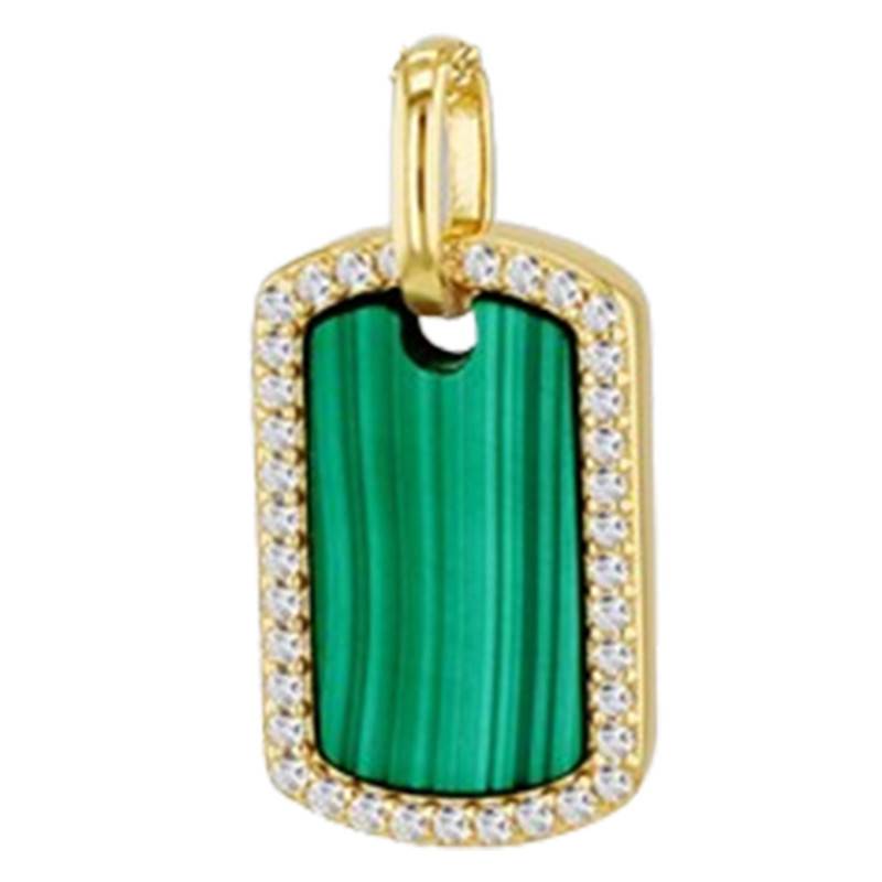 Ne laissant personne indifférent, ce sublime pendentif Dog Tag est le bijou intemporel et raffiné qu'il vous faut pour renouveler votre collection. Il est fait en argent 925 et est doté d'un placage en or jaune, lui conférant cette belle couleur dorée facile à assortir. Sa finition polie lui apporte une note radieuse en soulignant délicatement sa forme rectangulaire aux bords arrondis. Orné par un pavé de trente-huit oxydes de zirconium ronds et blancs de 1 mm de diamètre, ce pendentif est sublimé au centre par une malachite sertie clos qui rehausse son charme par ses couleurs vert et noir. Connue pour ses vertus apaisantes, cette gemme aide à améliorer la confiance en soi et à renforcer la paix intérieure. Elle affiche une longueur de 13 mm pour 8 mm de largeur. Ce pendentif dispose d'une bélière ovale avec laquelle il mesure 20 mm de hauteur. Sa largeur est de 10 mm.