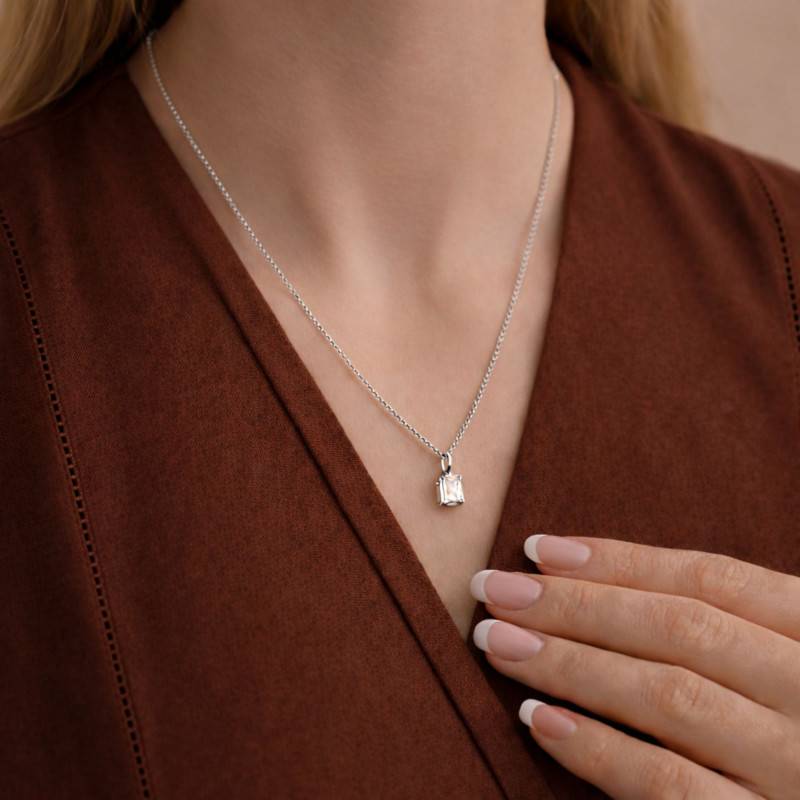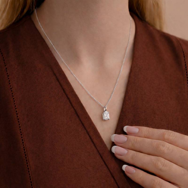 Ce pendentif en platine capture la lumière à travers un diamant de synthèse cultivés en laboratoire et taillé émeraude aux reflets cristallins. Le bijou, d'une élégance audacieuse, raconte une histoire d'éternité grâce à sa couleur D et sa pureté VVS2 certifié IGI. Sertie par de fines griffes, la pierre centrale décline sa majesté en plusieurs dimensions d'une Hauteur allant de 4 mm à 6,8 mm à une Largeur comprise entre 3,00 mm et 4,8 mm. Pour des poids variant de 0,30 ct à 1,00 ct. Ce trésor est rehaussé par une finition polie/brillante qui accroche le regard avec délicatesse.