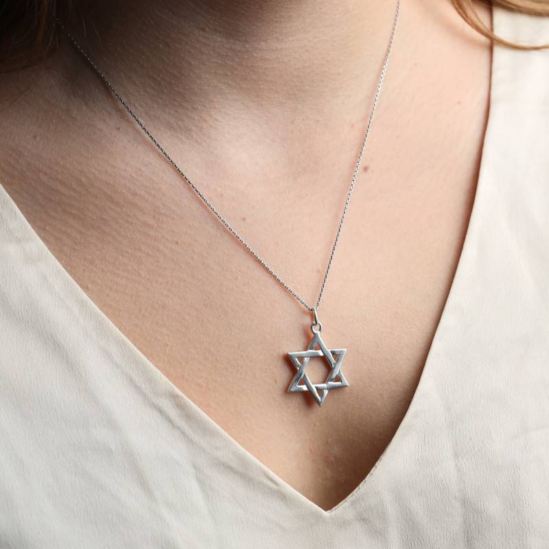Artemis vous propose de découvrir cette magen david en argent massif 925/1000 représente l'Etoile de David. L'étoile de David (maguen David ou magen David, littéralement « bouclier de David ») est le symbole du judaïsme. Elle se compose de deux triangles équilatéraux : l'un dirigé vers le haut, l'autre vers le bas. Aujourd'hui, on le trouve notamment sur le drapeau de l'État d'Israël. Elle représente, selon la tradition juive, l'emblème du roi David et serait aussi bien symbole du Messie (de lignée davidique). On pourrait dire que l'expression « étoile de David » est historique, tandis que l'expression « sceau de Salomon » a une connotation, une valeur, une ambiance magiques. Même dénotation, mais connotations distinctes. Jusqu'au XVe siècle, l'étoile de David ou Sceau de Salomon était un symbole magique protecteur, représenté sur les amulettes. Elle n'est devenue la représentation du judaïsme, comme l'est le crucifix pour le christianisme, qu'après l'expulsion des Juifs d'Espagne au XVe siècle, et grâce au développement de l'imprimerie. Le poids d'argent moyen du bijou est de 3,50 grammes. Ce pendentif est passivé, c'est à dire qu'un traitement de surface rend le bijou insensible à l'oxydation et lui apporte un éclat à nul autre pareil.