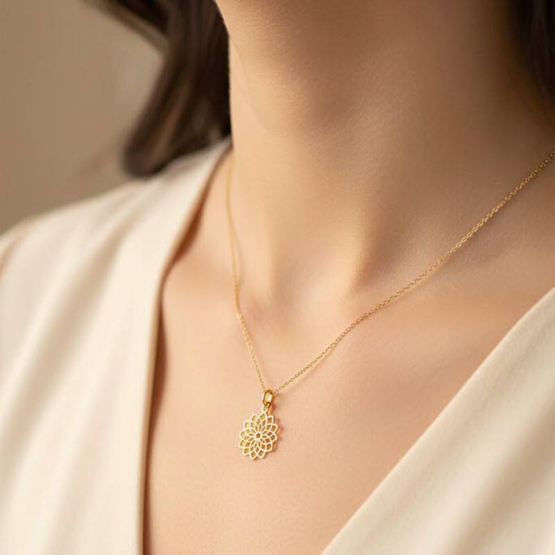 Le Pendentif Fleur de Lotus en Or Jaune 375 se déploie tel un symbole de pureté et de renaissance. Sa délicate structure en or jaune, soigneusement façonnée en or 375/1000 (9K), révèle une allure polie et brillante qui capte la lumière à chaque mouvement. Ce précieux ornement, d'un diamètre de 16,60 mm et d'une épaisseur de 0,20 mm, pèse 0,39 g, un souffle de grâce sur votre peau.