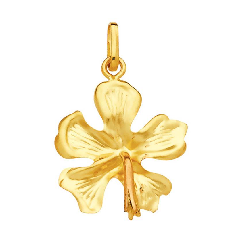 Succombez à ce pendentif hibiscus pays et régions. Ce pendentif est réalisé entièrement en or jaune 750/1000 (18K) pour éviter que sa couleur ne s'estompe avec le temps. Vous allez adorer sa forme qui n'est autre qu'une fleur d'hibiscus ! La fleur d'hibiscus est une fleur exotique très présente sur les îles antillaises. Cette fleur est très aimée car elle est le symbole de l'amour, de la joie et de la tendresse. Ce pendentif serait donc parfait en cadeau à un être cher et apporterait la preuve d'un amour profond.
