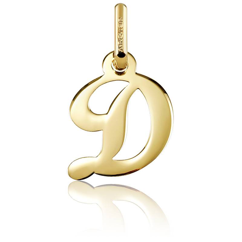 Découpé en or jaune 750/1000 (18K), ce pendentif de la maison Argyor représente la lettre D inscrite dans une typographie anglaise pour un effet calligraphique subtil et élégant. D'une hauteur de 12 mm pour une largeur 11 mm, le poids d'or moyen de ce pendentif est d'environ 0,43 gramme. La hauteur de ce pendentif avec la bélière est de 17 mm.