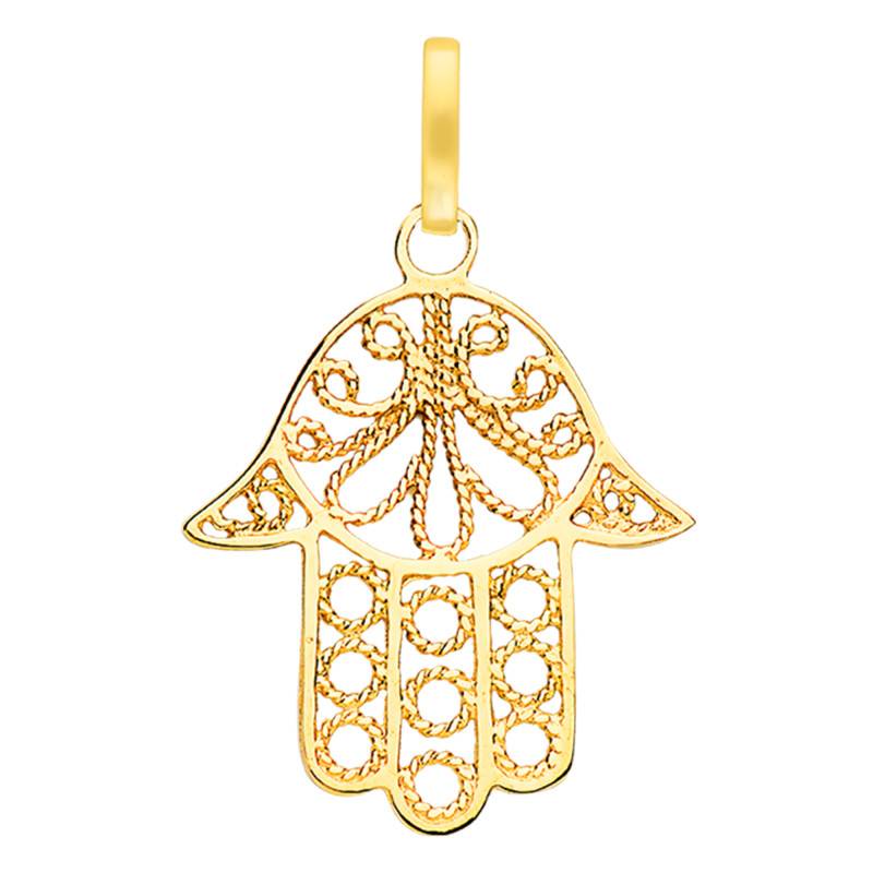 C'est à la manière des attrapes rêves que le motif central de cette main est travaillé. Mariant fils torsadés en forme de courbes et de cercles, celui-ci est empreint de douceur et de féminité. Entièrement ajourée, cette création offrira de sublimes reflets dorés jouant avec votre peau. Cette main s'accompagne d'une bélière d'une hauteur de 8 mm.