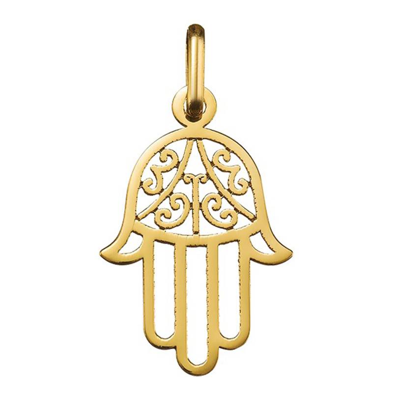 Affichant des dimensions de 14 x 18 mm, ce pendentif en or jaune offre un éclat à nul autre pareil grâce à sa finition polie. Finement ajouré, il présente un motif central s'inspirant des courbes et spirales géométriques. Celui-ci fort du travail des ses détails minutieux, confère au bijou élégance et sophistication. la bélière ovale, vous donne la possibilité d'accompagner cette main de la chaîne de votre choix. Avec un poids d'or moyen de 0,70 gramme, ce splendide pendentif soulignera avec finesse les lignes de votre cou et agira comme talisman contre le mauvais oeil.