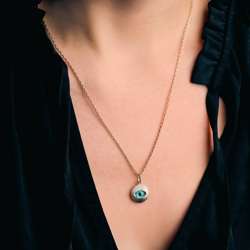 Emanessence vous propose ce sublime pendentif œil porte-bonheur. Il se compose d'or jaune 375/1000 (9K) ou 750/1000 (18K), selon votre choix, avec des poids respectifs de 0,75 g et 1,05 g. Le pendentif est de forme ronde, avec au centre un œil de couleur bleue et autour des motifs rainurés. Le diamètre de ce bijou est de 13,0 mm (sans la bélière).