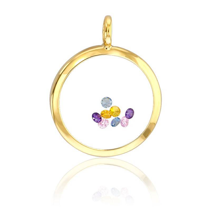 Vous ne résisterez pas au charme très original de ce bijou. Ce pendentif est composé d'un cercle en or jaune 750/1000 (18K). A l'intérieur de ce cercle se trouve un verre minéral transparent qui est détient des pierres semi précieuses oranges, violets, bleus et roses. Ces pierres peuvent bouger dans le cercle sans le rayer. Ce pendentif fait 20 mm de diamètre pour 2,50 mm d'épaisseur. La bélière du pendentif mesure 6 mm et le poids d'or moyen est quant à lui de 0,50 gramme.