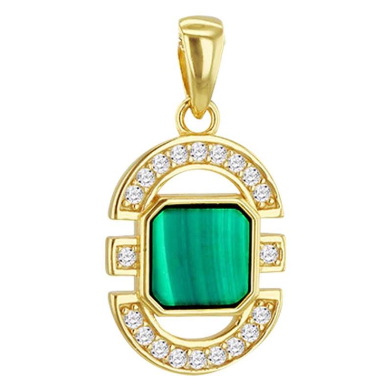 Inspiré des codes emblématiques de l'Art Déco, ce fascinant pendentif se prêtera à toutes vos occasions. Ce bijou épuré et délicat est réalisé en argent 925 et dévoile une brillance dorée exquise due à sa finition polie et à son placage en or jaune. Il prend une forme ovale découpée, dont les bordures sont serties à grains par vingt oxydes de zirconium ronds de 1 mm de diamètre. La couleur blanche de ces derniers donne une touche d'éclat à l'ensemble et met en valeur une belle malachite ornée au centre. Taillée de forme octogonale, cette gemme séduit par sa couleur verte et apporte à son porteur confiance, apaisement et équilibre. Elle mesure 8 mm de largeur pour une longueur de 8 mm. D'une largeur de 12 mm, ce pendentif dispose d'une bélière ovale avec laquelle il mesure 23 mm de hauteur.