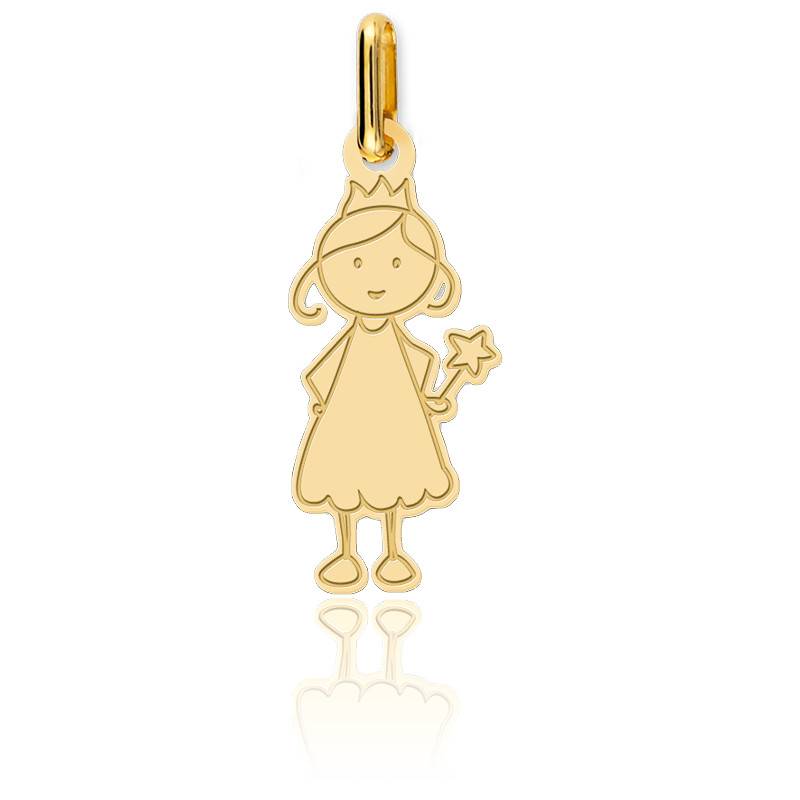 Ce pendentif de la maison espagnole Lucas Lucor est conçu en or jaune 750/1000 (18K) et représente une petite fée couronnée tenant une baguette dans sa main gauche et appuyant sur ses hanches. Affichant des dimensions de 16 millimètres pour une hauteur de 6,50 millimètres, ce pendentif intègre un poids moyen d'or à la fabrication de 0,60 gramme.
