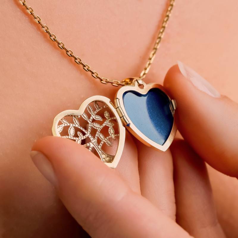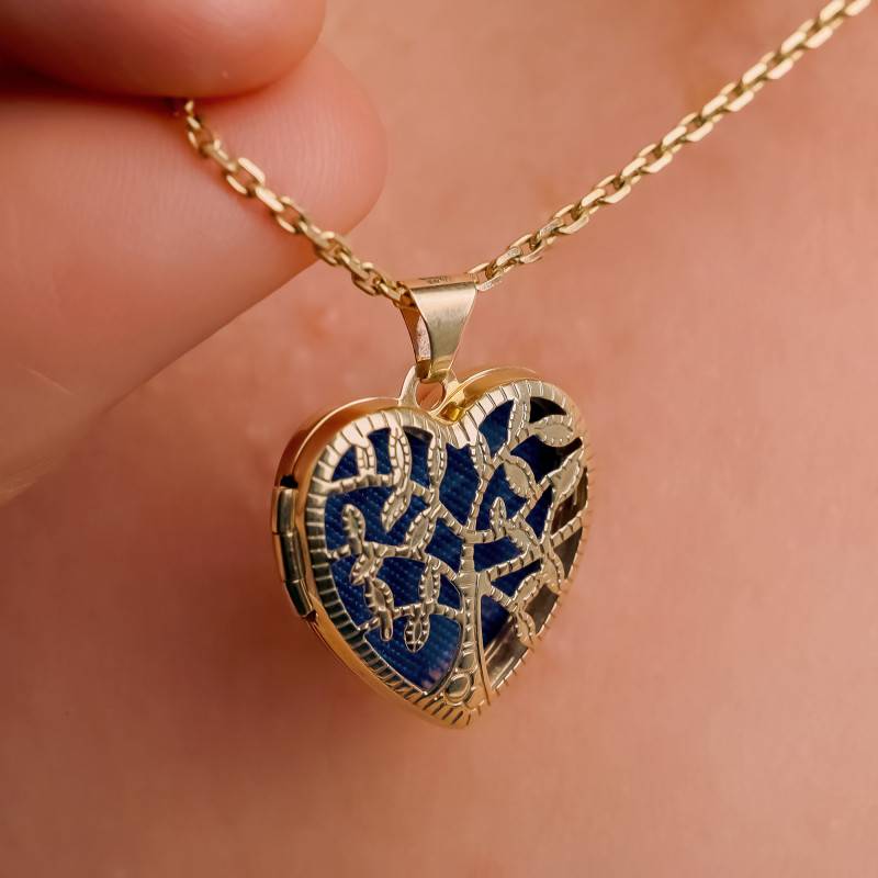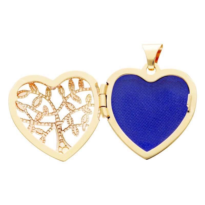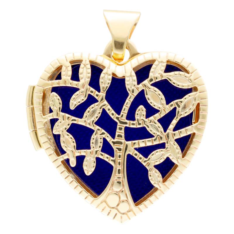 Nous vous invitons à découvrir ce beau pendentif porte photo coeur. Romantique, il deviendra un indispensable de votre collection. Il se présente sous forme d'un cœur conçu en or jaune 375/1000 (9K) et se trouve décoré finement par un arbre de vie. Ajouré, il laisse voir la toile bleue interne qui contraste incroyablement bien avec la teinte dorée du médaillon. Symbole de l'éternité, il vous accompagnera par ses multiples vertus. Ce médaillon dispose d'une taille de 19,00 mm x 23,50 mm, d'une profondeur de 6 mm et d'un poids d'or de 1,40 gramme. Noter que son ouverture à charnière vous permettra de glisser à l'intérieur une photo ou même un souvenir.