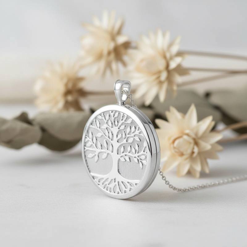 Ce splendide pendentif arbre de vie représente la source de vie éternelle, la croissance et la vitalité. Il s'agit d'un bijou de couleur grise pourvu d'une finition polie à l'avant et satinée à l'arrière. Cette création, de forme ronde, est réalisé en argent 925 plaqué au rhodium ce qui lui permet d'être extrêmement lumineuse. Ce pendentif mesure 22 mm de largeur et 27 mm de hauteur, bélière incluse. Il est orné de lignes striées avec un motif arbre de vie et s'ouvre pour vous permettre d'y mettre une photo.