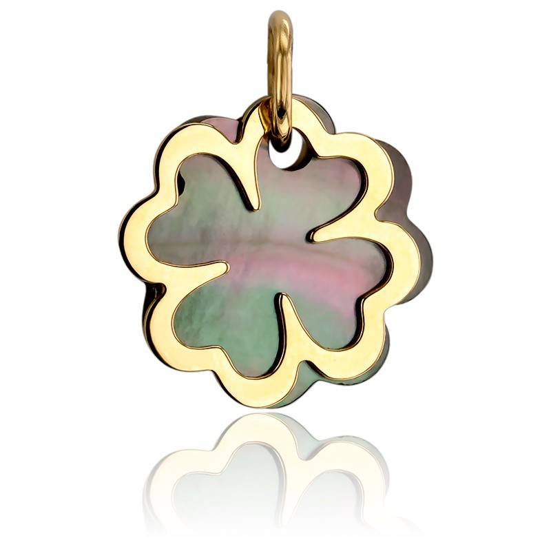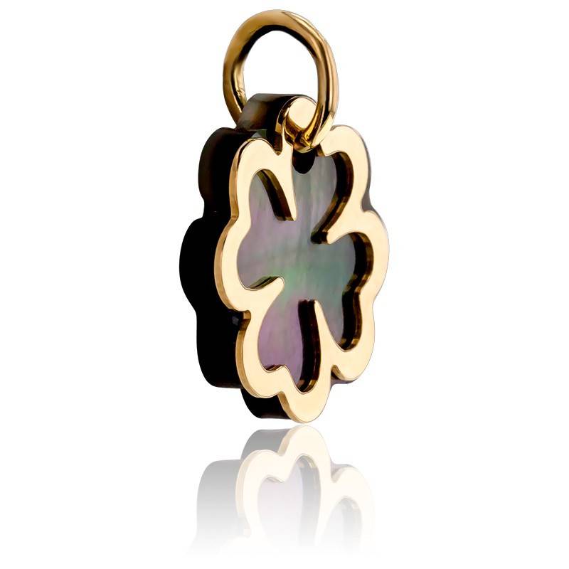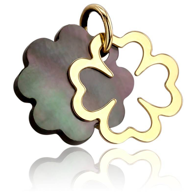 Emparez-vous de cet élégant pendentif de 12 mm de diamètre représentant une trèfle à 4 feuilles en nacre grise découpée. Vous retrouverez une nacre claire d'un côté du pendentif et une nacre plus foncée au verso. Une trèfle ajouré en or jaune 750/1000 (18K) vient se superposer au trèfle à 4 feuilles en nacre. Un bijou qui deviendra très vite votre porte-bonheur. Le poids d'or moyen est de 0,36 gramme.