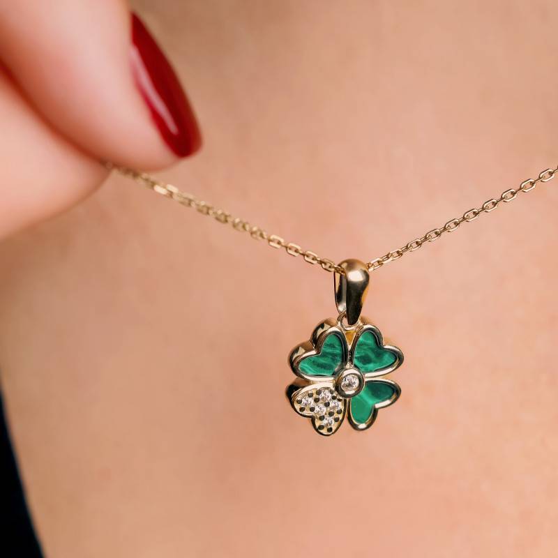 Ce pendentif trèfle en or jaune 375 est une véritable ode à la nature. L'éclat vibrant du trèfle est sublimé par une malachite de synthèse d'un vert envoûtant et des oxydes de zirconium cubiques blancs étincelantes. Avec une largeur de 10 mm et une hauteur de 16 mm, ce bijou de 0,65 g offre une délicatesse subtile. Le serti à grains ajoute une touche de sophistication, tandis que la finiton polie et brillante reflète la lumière de façon enchanteresse.