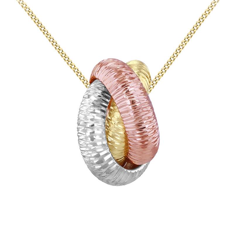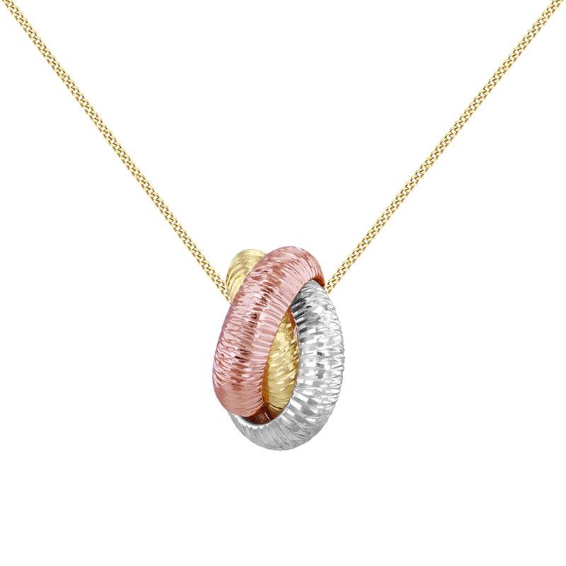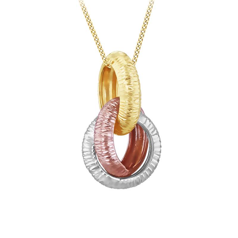 Ce Pendentif Triple Anneaux Ciselés en 3 Ors 375 est une ode au raffinement et à l'audace. Trois anneaux étincelants s'entrelacent dans une danse éternelle, capturant les nuances délicates de l'or gris, jaune et rose. Ce bijou en or 375/1000 (9K) présente une finiton polie et brillante qui éclaire chaque mouvement d'une lueur céleste. Mesurant 14 mm de largeur et de hauteur, et pesant avec légèreté 1,10 g.
