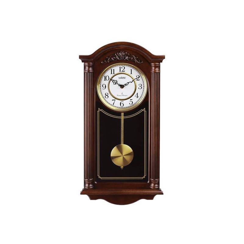 La pendule murale à carillon en bois VP60001 proposée par Vedette se démarque par son originalité. Avec ses dimensions de 48.6 cm de hauteur, 24.4 cm de largeur et 9.7 cm d'épaisseur, cette pendule ornera votre mur tel un tableau. Elle est fabriquée en bois et son pendule arbore une précieuse couleur dorée. Un grand verre minéral protège le modèle sur presque toute sa hauteur. Le bois marron foncé et met en valeur le cadran blanc à la finition double cercle délimités en doré qui affiche en noir les index des heures en chiffres arabes, le chemin de fer des minutes pointés par deux aiguilles noires.