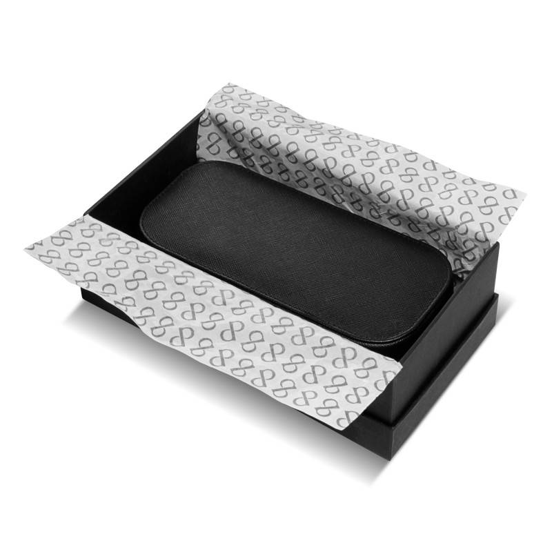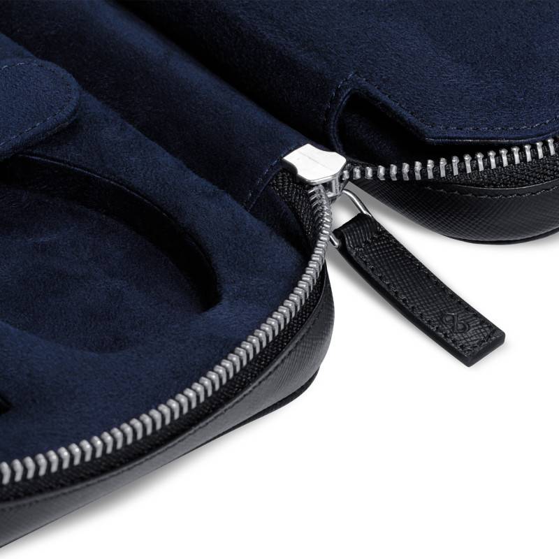 Cuir de vachette saffiano noir avec un intérieur en suédine bleu marine