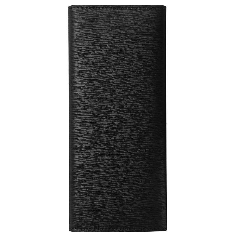 Le cuir de veau pleine fleur, dans lequel a été conçu ce porte-stylo, a été imprimé, tanné au chrome et teinté d'un noir opaque. Ces étapes de fabrication garantissent que sa couleur noire n'évoluera pas dans le temps. Les bordures présentent des surpiqûres ton-sur-ton d'une belle solidité. Le modèle mesure 70 x 10 x 160 mm et pèse 77g.