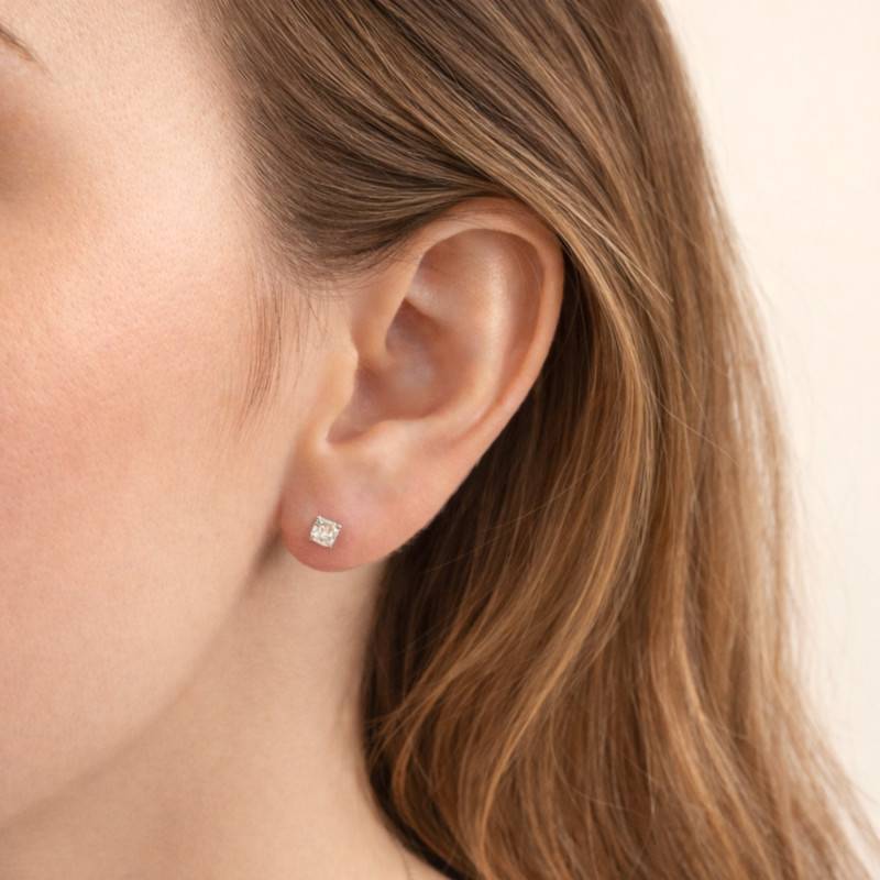 Élégantes et minimalistes, ces puces d'oreilles sont particulièrement sublimes. Leur design fin et épuré reflète un beau rendu qui illuminera délicatement votre look. Elles sont réalisées en or blanc 750/1000 (18K) et serties chacune d'un diamant coussin de 0,25 carat, soit 0,50 ct au total. De couleur G et de pureté SI1, chacun de ces derniers mesure 3,40 mm de largeur et 5,00 mm de hauteur pour une épaisseur de 3 mm. La tige dispose d'une longueur de 9 mm. Ces clous d'oreilles pèsent 0,91 gramme et se fixent au moyen de fermoirs poussettes papillon.