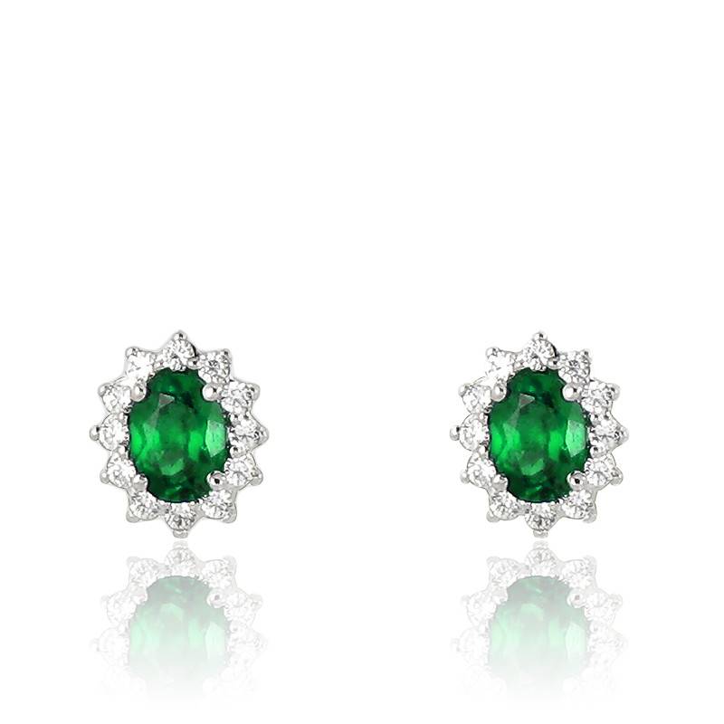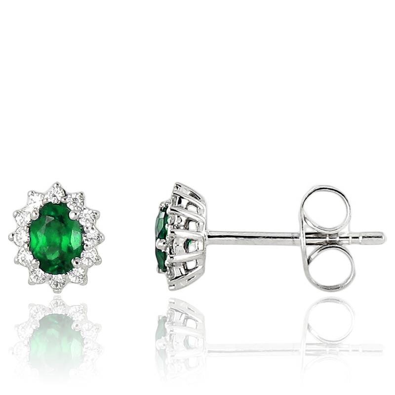 Elégantes et sophistiquées, ces puces d'oreilles or blanc 750/1000 (18K) apporteront une touche d'éclat à vos tenues. L'émeraude centrale taille ovale de 0,34 carat serti 4 griffes, fait environ 4mm de diamètre. La puce d'oreille est pavée de 12 diamants sertis à 3 griffes, formant un ovale autour de l'émeraude centrale. Ces pierres taille brillant, sont de qualité GSI2. Le serti 4 griffes de l'émeraude permet une optimisation de la qualité d'implantation. Ces puces d'oreilles ont un fermoir de type poussette papillon. Enfin, le poids total en carat de la paire est de 0,46 carat.