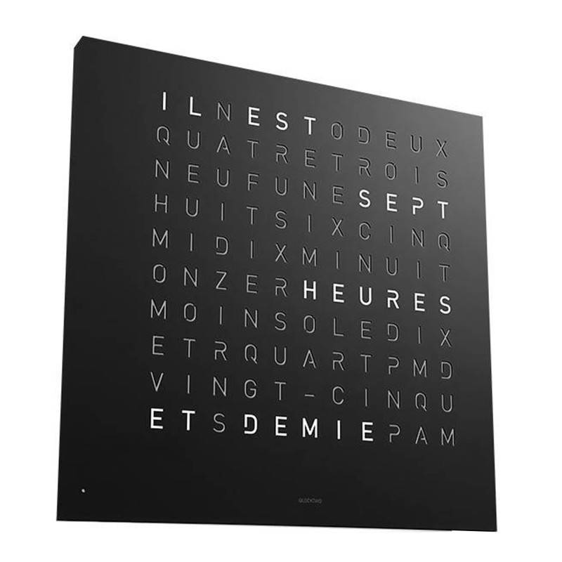 Horloge murale ou sur pied, au format 45 x 45 cm en bois laqué à plusieurs couches. La face de QLOCKTWO est maintenue par des aimants, sans éléments de fixation visibles. On peut de cette manière l'échanger facilement. Il existe en acier inoxydable brossé ou en verre synthétique, poli disponible en sept coloris.